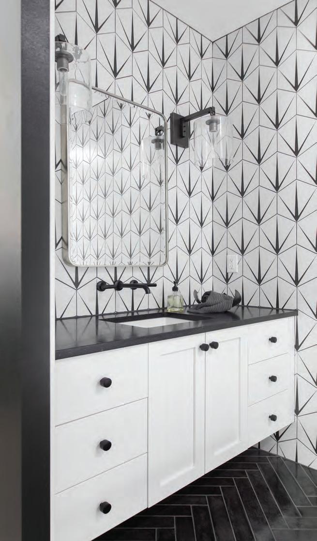 The two bathrooms in this home have one thing in common: gorgeous counter-to-ceiling tile. Both rooms include a dramatic pattern in simple palettes; one gray and white and the other black and white.