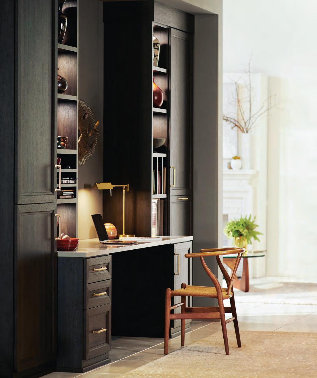 quartzite counters. Mixing brass details and black-and-white color with the wood gives this space a timeless feel.
