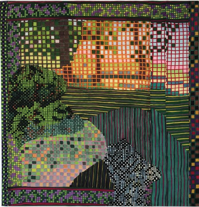 A solo exhibition by artist Lauren Luloff, Green World presents thirteen new dyed silks created by the artist in 2022. Luloff dyes silk to create captivating environments stewed with rich colors, textures, and a sense of touch. Through painting and sewing, the artist collages together disparate elements whose friction and harmony coalesce to form a narrative. Luloff’s pieces are about endlessness, the everlasting flow of images, narratives, and color relationships.