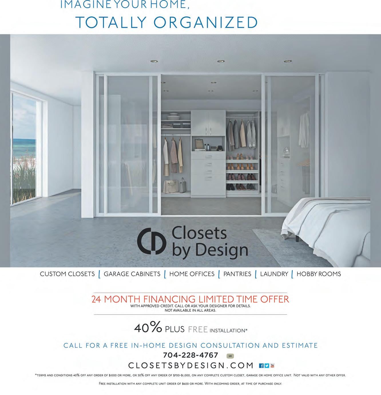 ©2022 California Closet Company, Inc. Each California Closets® franchised location is independently owned and operated. CALL OR VISIT US ONLINE TODAY TO SCHEDULE YOUR COMPLIMENTARY DESIGN CONSULTATION 704.527.5579 CALIFORNIACLOSETS COM