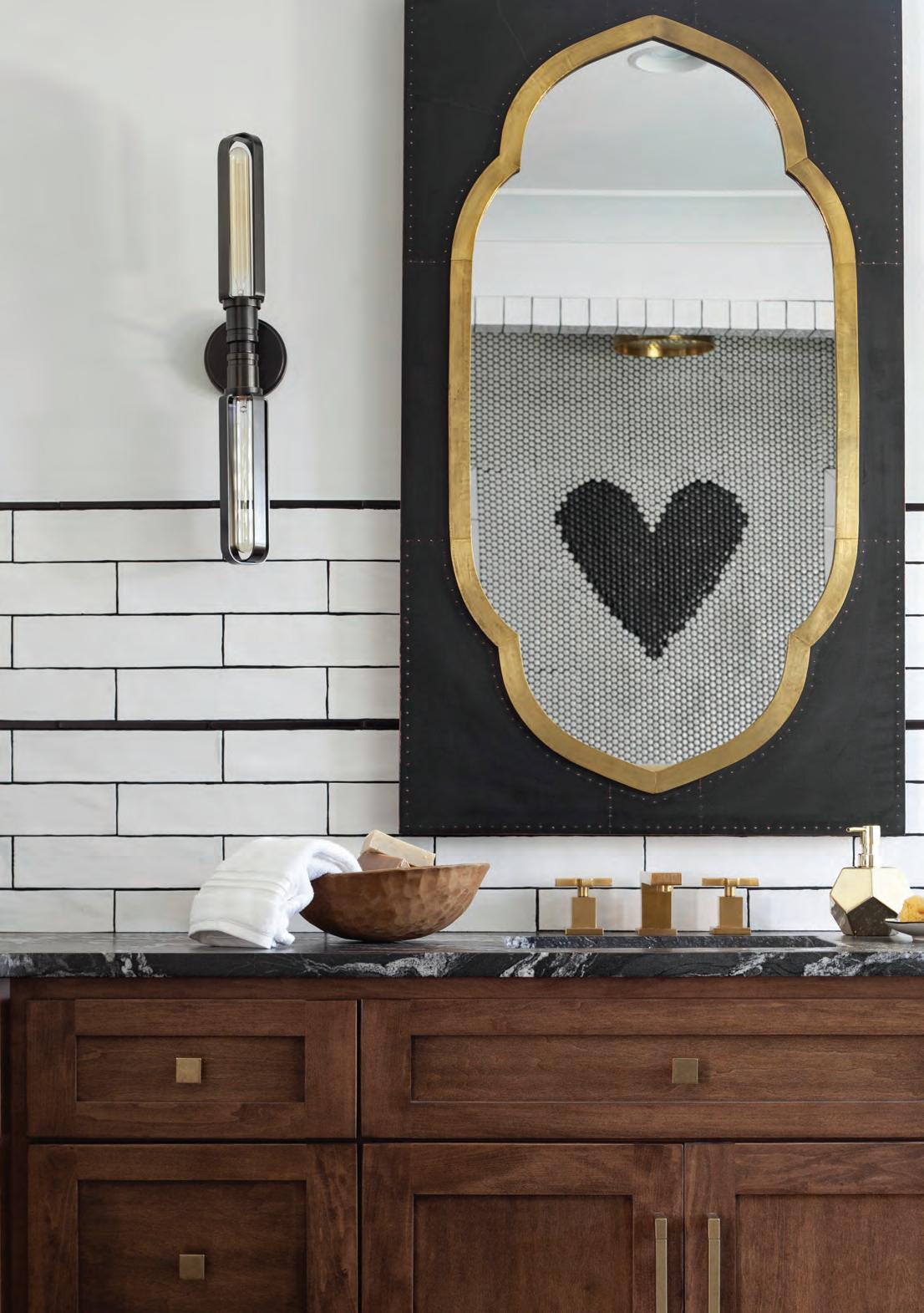 Take this bathroom, for example. While a white subway tile is not necessarily unique, we used a handmade version with slightly irregular edges. I chose a black pencil tile to create a horizontal detail break and black grout to make the tile really stand out. In the shower, which is full of white penny tile, we added a black penny tile heart for an element of fun, creating a little whimsy in the otherwise sophisticated space. To ground all the white and black, a warm wood-toned cabinet was added, as well as black