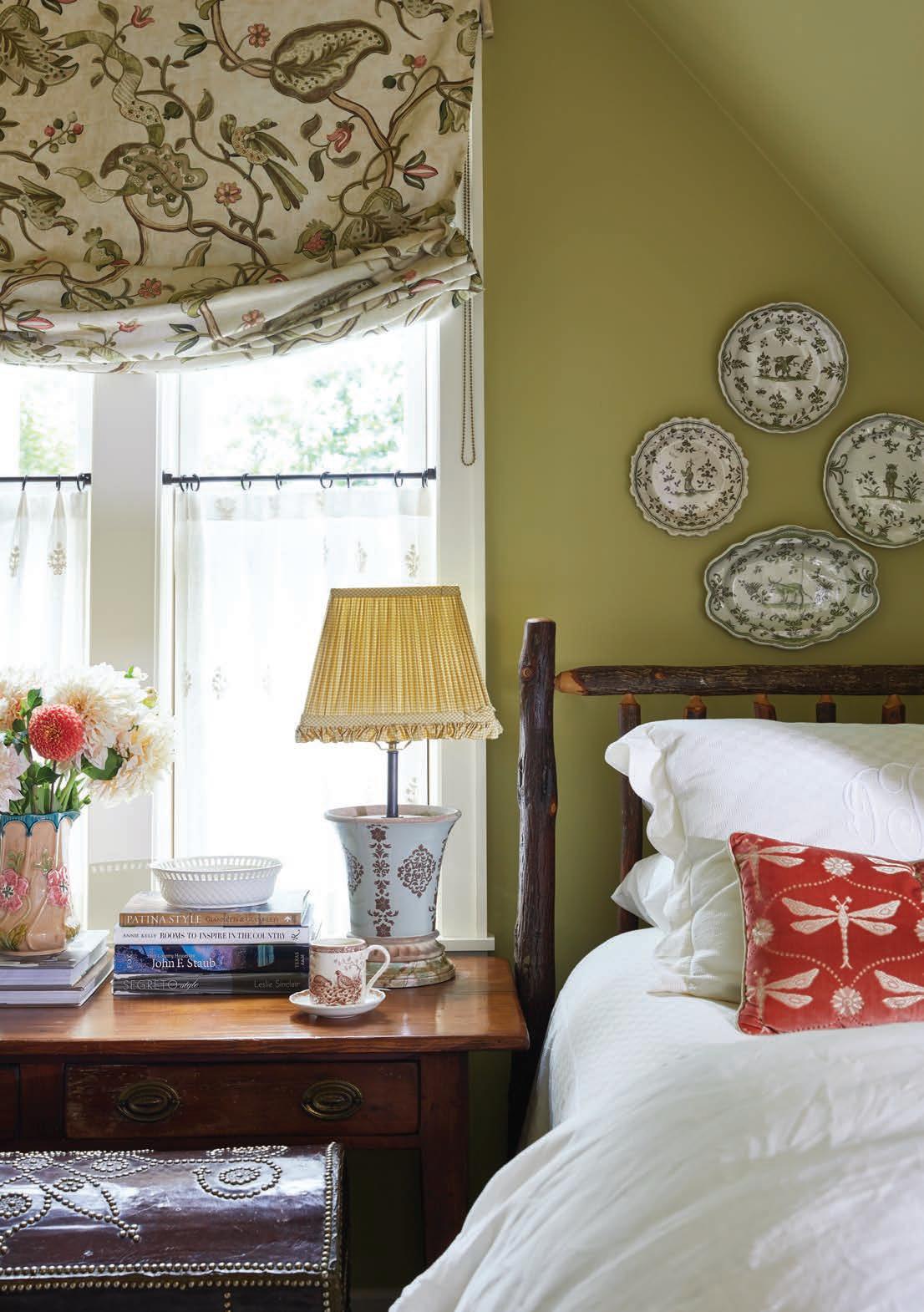 With such a small footprint to work with in the guest bedroom, the challenge was finding wall space for the bed. Bossard fit the bed into a tight area and covered an existing window with a half-tester valance. “I normally don’t like putting a bed in front of a window,” says Bossard, “but in this case, there are two other windows in the room, so there was plenty of natural light.”