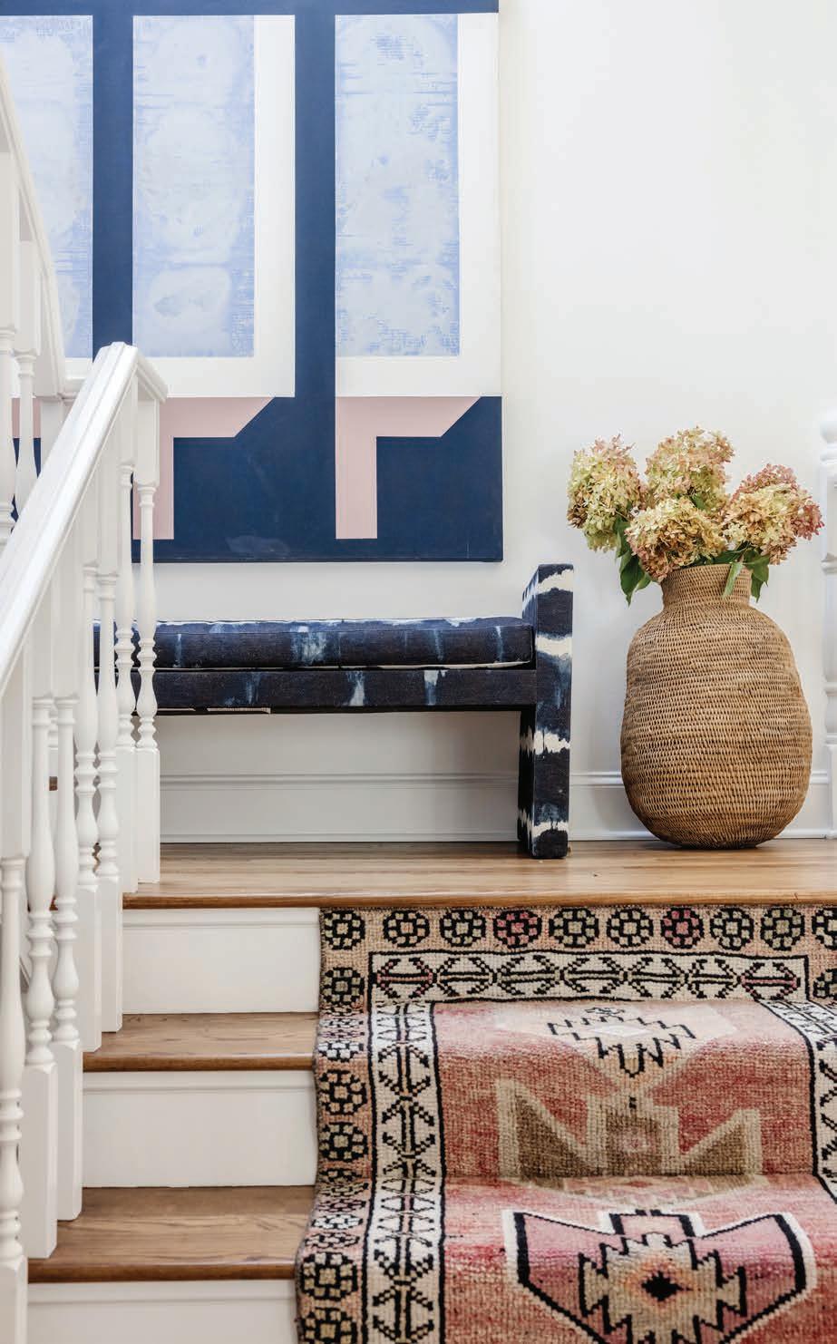 "The timing of the project was perfect, as we were in the midst of a serious vintage sourcing trip to Round Top, Texas, overlapping with High Point Market," recalls Lentini. "We were able to send the clients photos and make purchases in real time. We snagged the incredible rug for the living room, artwork for the landing, a vintage chair, a floor lamp, and a coffee table for the living room. It's such an incredible way to design for a client." The shelves in the living room house some of HON’s special travel finds, like their Embera masks from Panama alongside a nine-foot canvas tree and the vintage chair from the sourcing trip to Round Top. A custom vintage Moroccan runner covers the stairs, and the bench is from Kravet, covered in custom fabric.