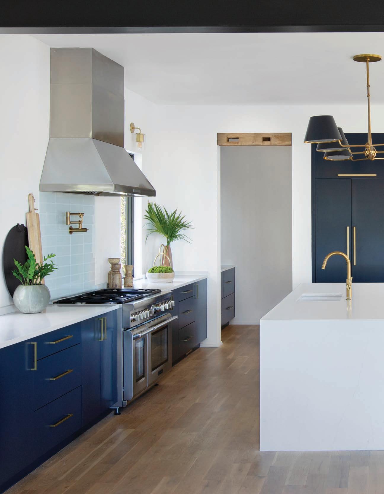 The homeowners wanted an openconcept kitchen that was both clean and dramatic. Buchanan chose navy cabinetry accented with brass hardware to apply a subtle coastal feel, while X-back leather counter stools from Modern History keep the room grounded. A chandelier from The Urban Electric Co. hangs above the waterfall island, and a vintage rug purchased from Zuma Imports adds warmth.