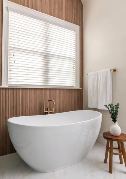 freestanding tub replaced a dated built-in tub. Odstrcil backed it with a statement wall of wood-look tile in an earthy tone with a raised, fluted surface that provides movement, warmth, and a contemporary vibe. Largeformat floor tiles are reminiscent of marble and contrast with ebony Caesarstone Vanilla Noir quartz countertops with bold creamy veins running across them.