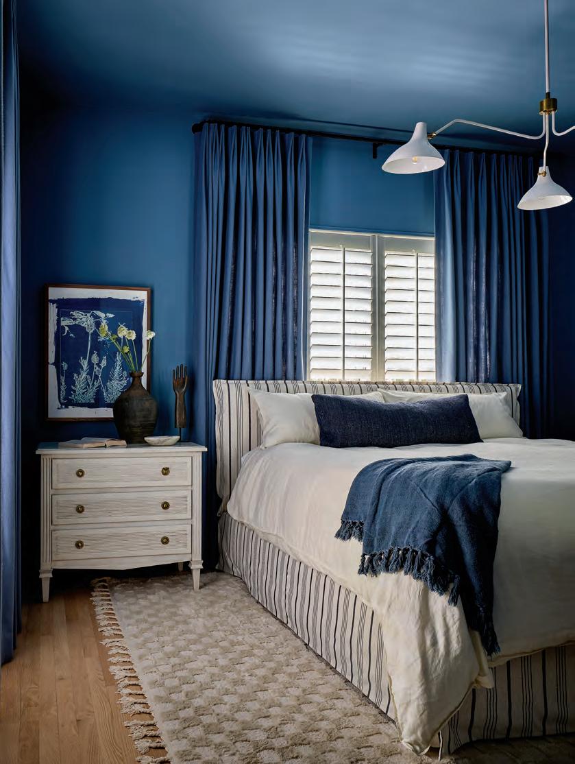 In the home office, Applegate painted the walls a bold blue and positioned an Eames chair in the corner to create a cozy reading nook. Wall paint: Benjamin Moore Ocean Floor. Chair: Herman Miller.