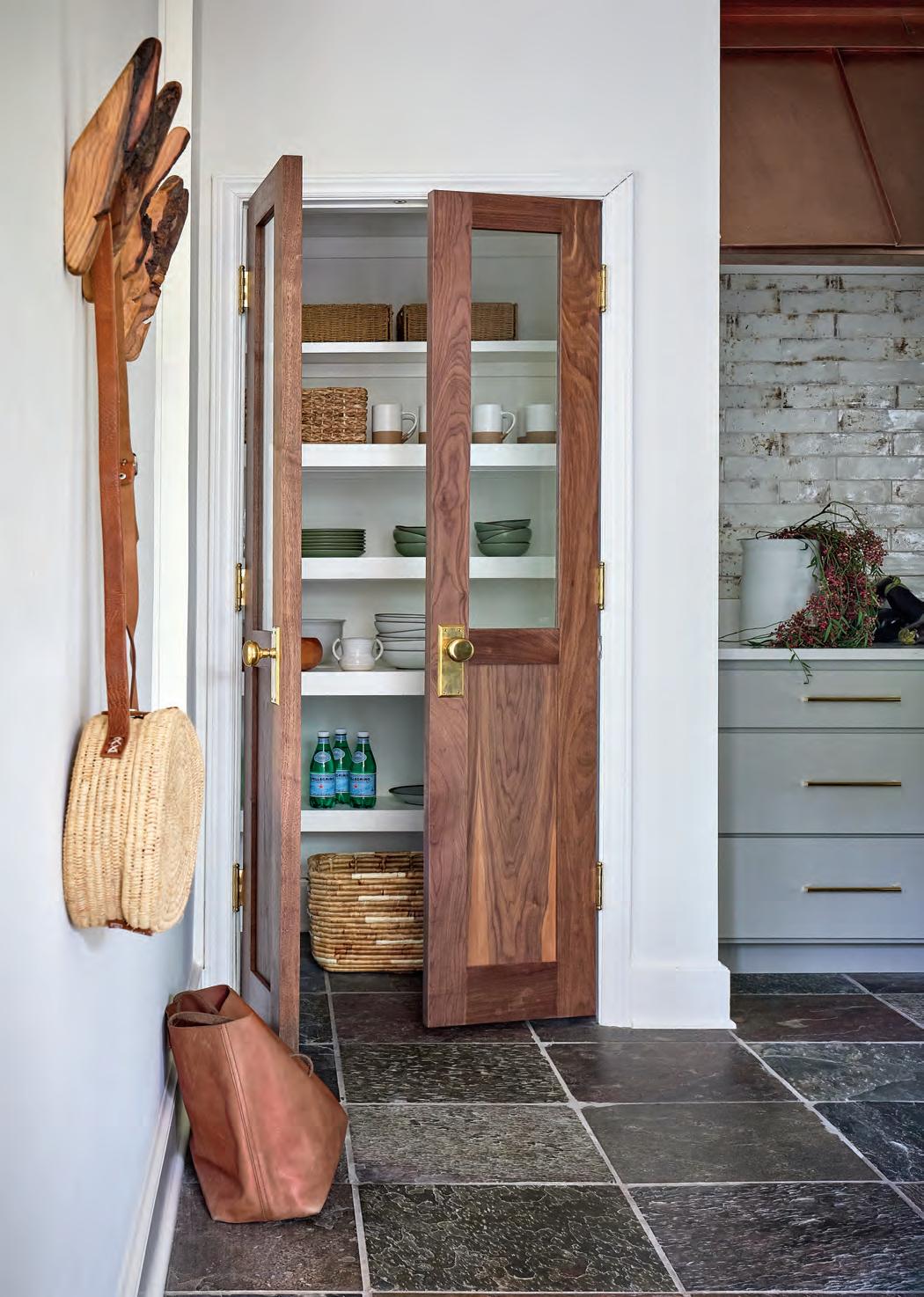 Visible from the front entry, the pantry door was crafted locally with gorgeous wood and glass panels, and finished nicely with unlacquered brass hardware to patina over time. Pantry door: Custom. Hardware: ALNO. Plumbing: House of Rohl. Countertops: Calacatta Bello quartz. Cabinetry paint: Benjamin Moore Thunder.