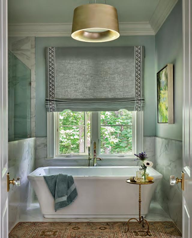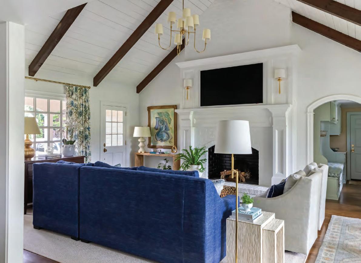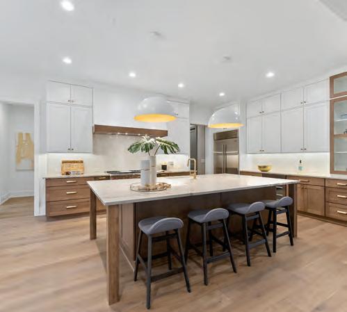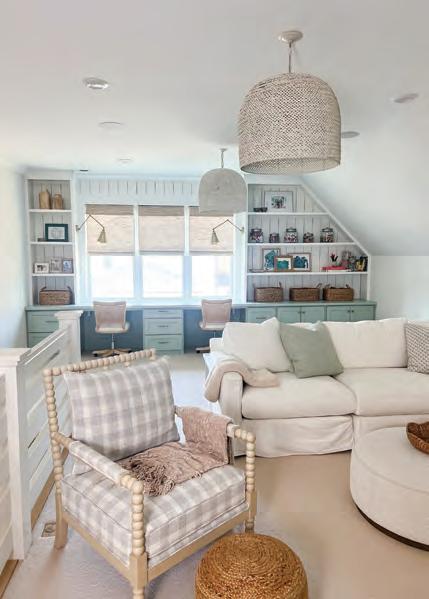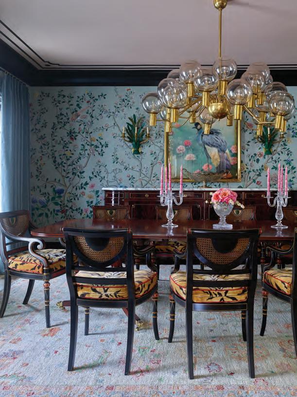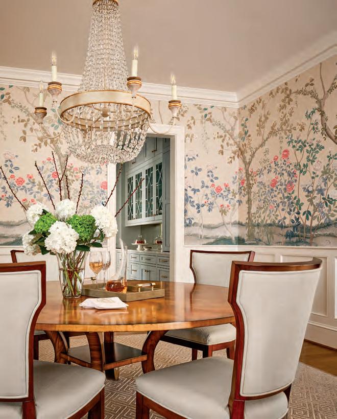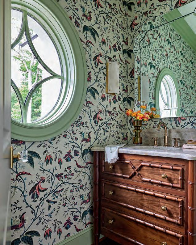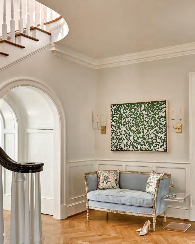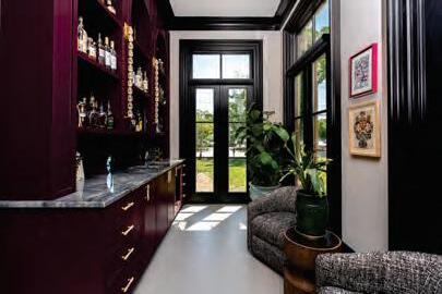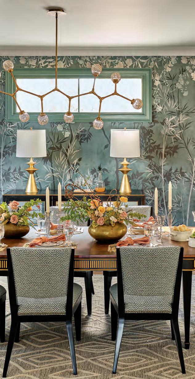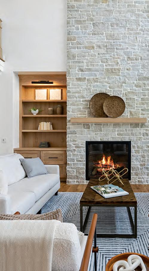 DESIGNER MARTHA SCHNEIDER of La Maison wanted to create a timeless and functional home for a family of four, focusing on comfort while keeping traditional flair. To achieve this, Schneider incorporated various finish details, luxurious paint colors, lighting, wallpaper, fabrics, and trims to connect the home’s rich history to modern living. The kitchen and living room were separate and closed off in the original floor plan, but by opening both rooms, Schneider created a more spacious and lightfilled environment. This older home begged for contemporary updates throughout. The fireplace was redesigned with traditional details for a modern family and an elevated look that complemented the triumphant vaulted ceilings, which draw the eye upward. The result is a stunning transformation that made this home both a reflection of its historical roots and a warm, inviting space for modern family living.