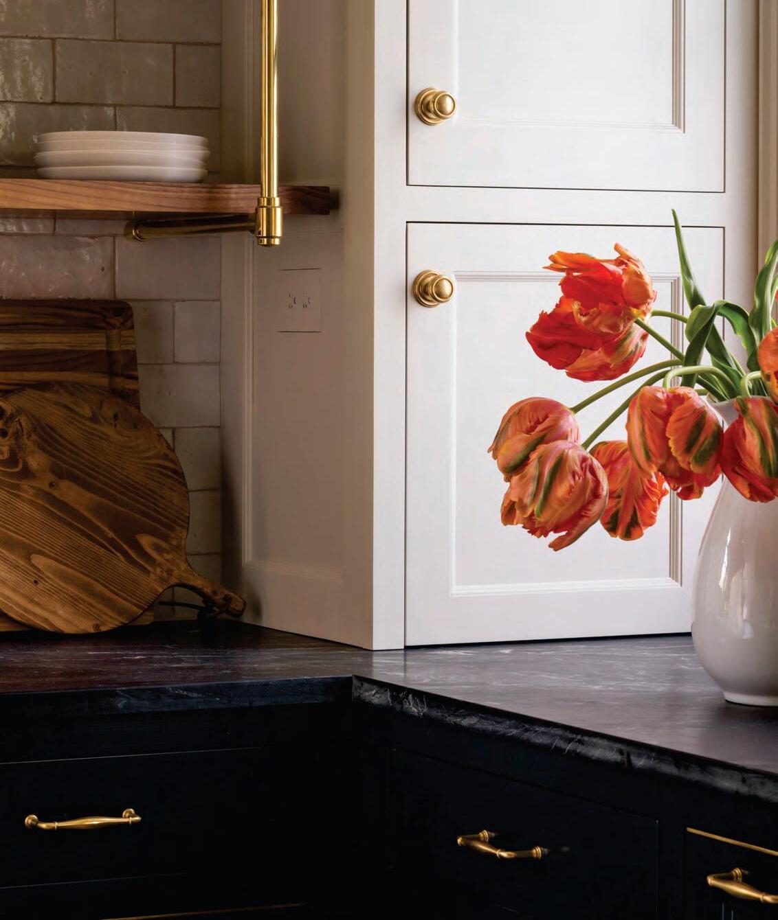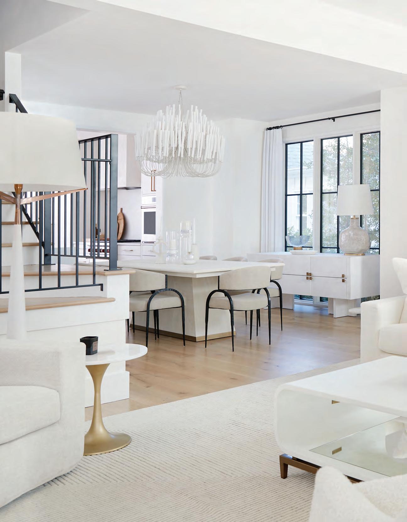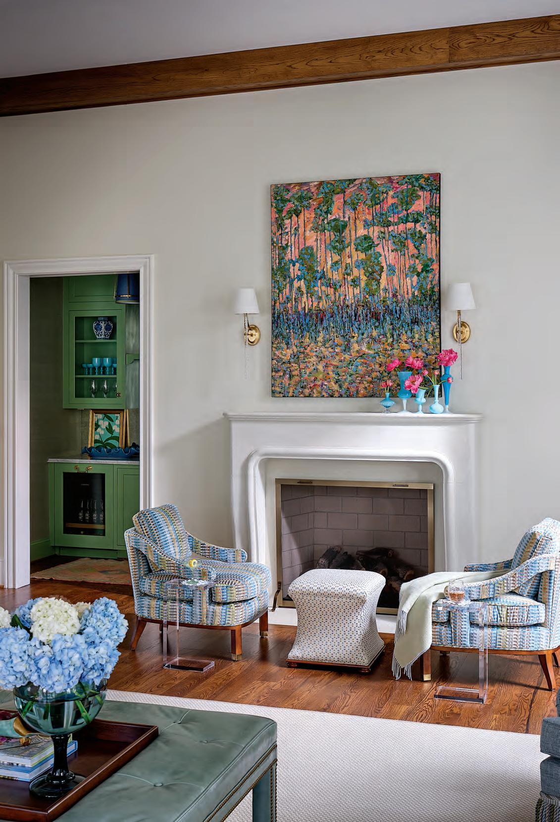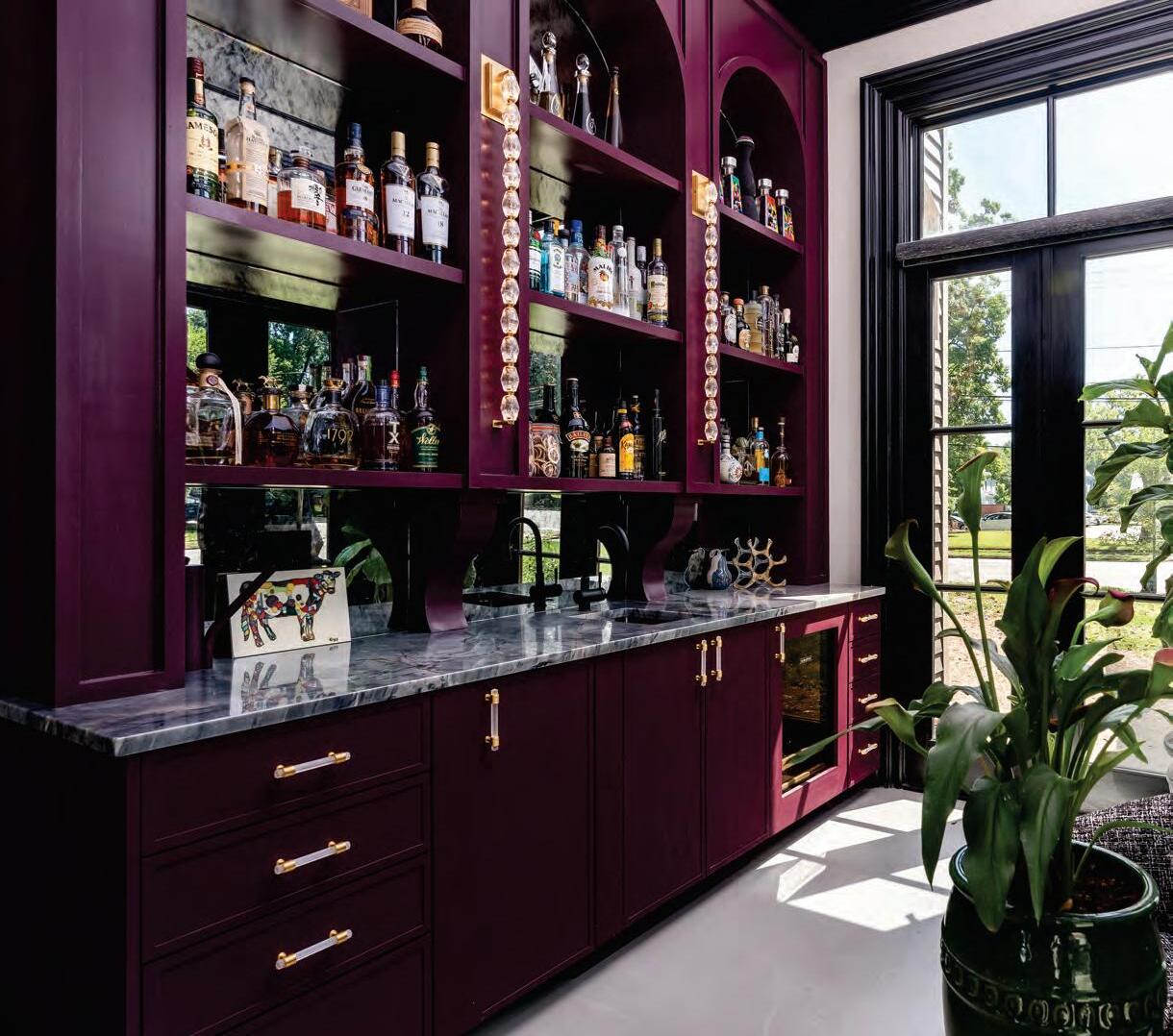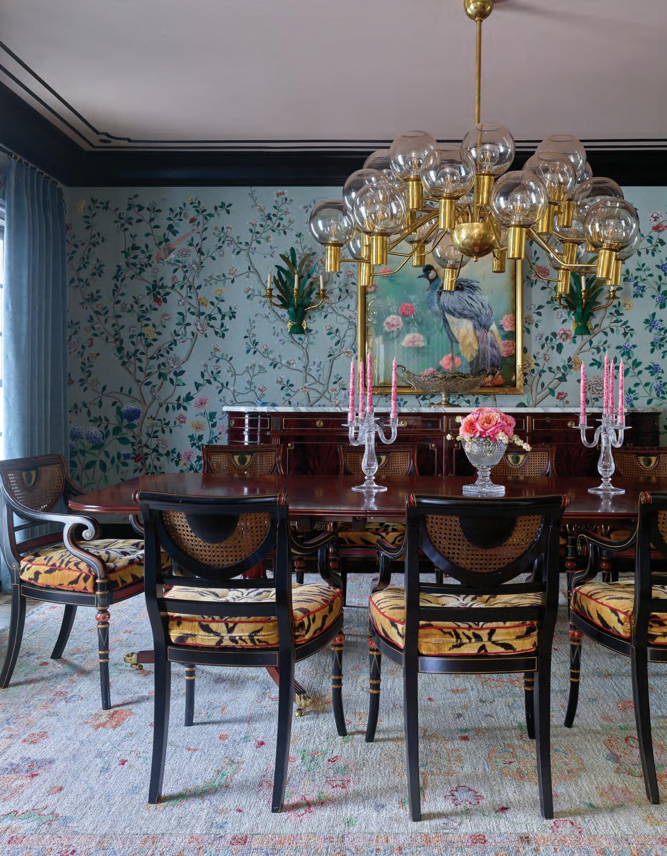 DESIGNER MARTHA SCHNEIDER of La Maison wanted to create a timeless and functional home for a family of four, focusing on comfort while keeping traditional flair. To achieve this, Schneider incorporated various finish details, luxurious paint colors, lighting, wallpaper, fabrics, and trims to connect the home’s rich history to modern living. The kitchen and living room were separate and closed off in the original floor plan, but by opening both rooms, Schneider created a more spacious and lightfilled environment. This older home begged for contemporary updates throughout. The fireplace was redesigned with traditional details for a modern family and an elevated look that complemented the triumphant vaulted ceilings, which draw the eye upward. The result is a stunning transformation that made this home both a reflection of its historical roots and a warm, inviting space for modern family living.