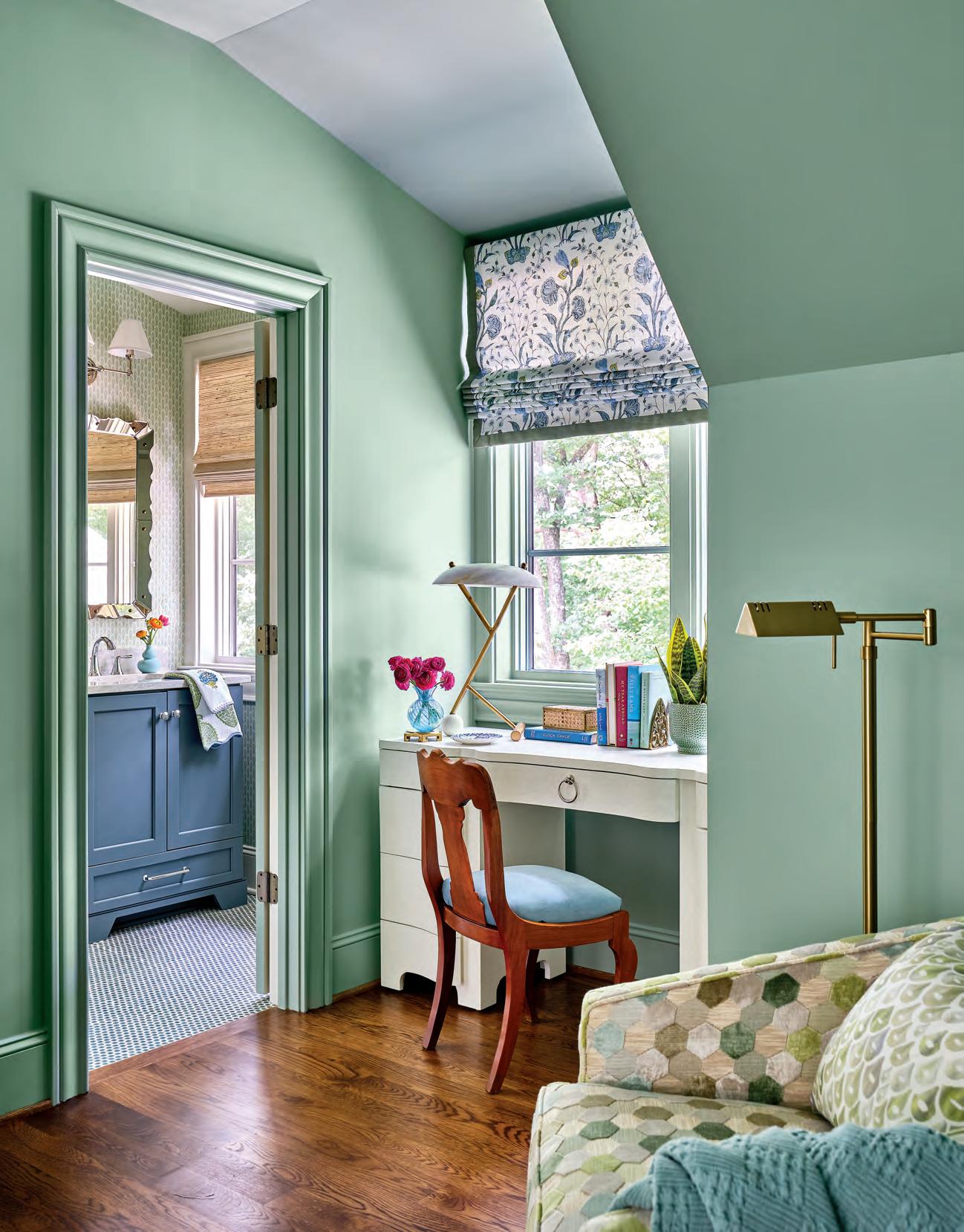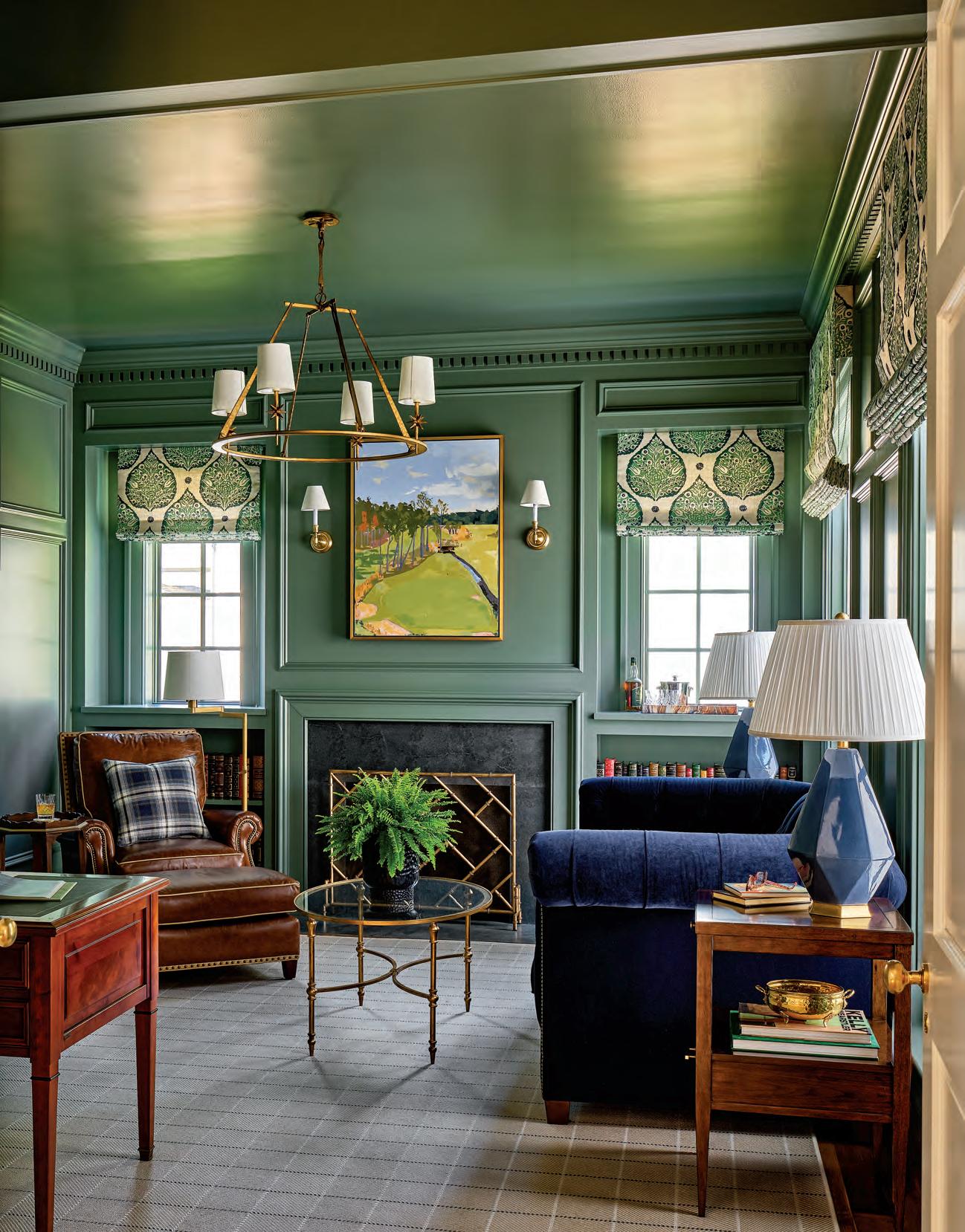Cox tailored the floor plan even before construction broke ground by adding the barrel-vaulted ceiling in the entryway for a grand statement and a box-beam ceiling in the dining room to highlight Susan’s request for a Visual Comfort chandelier. She also began incorporating a palette of greens and blues (Susan’s favorite colors) throughout the interior in a range of bright shades and bold patterns. “What drew me to Kara was her use of color,” Susan says. “I didn’t want a neutral house.”