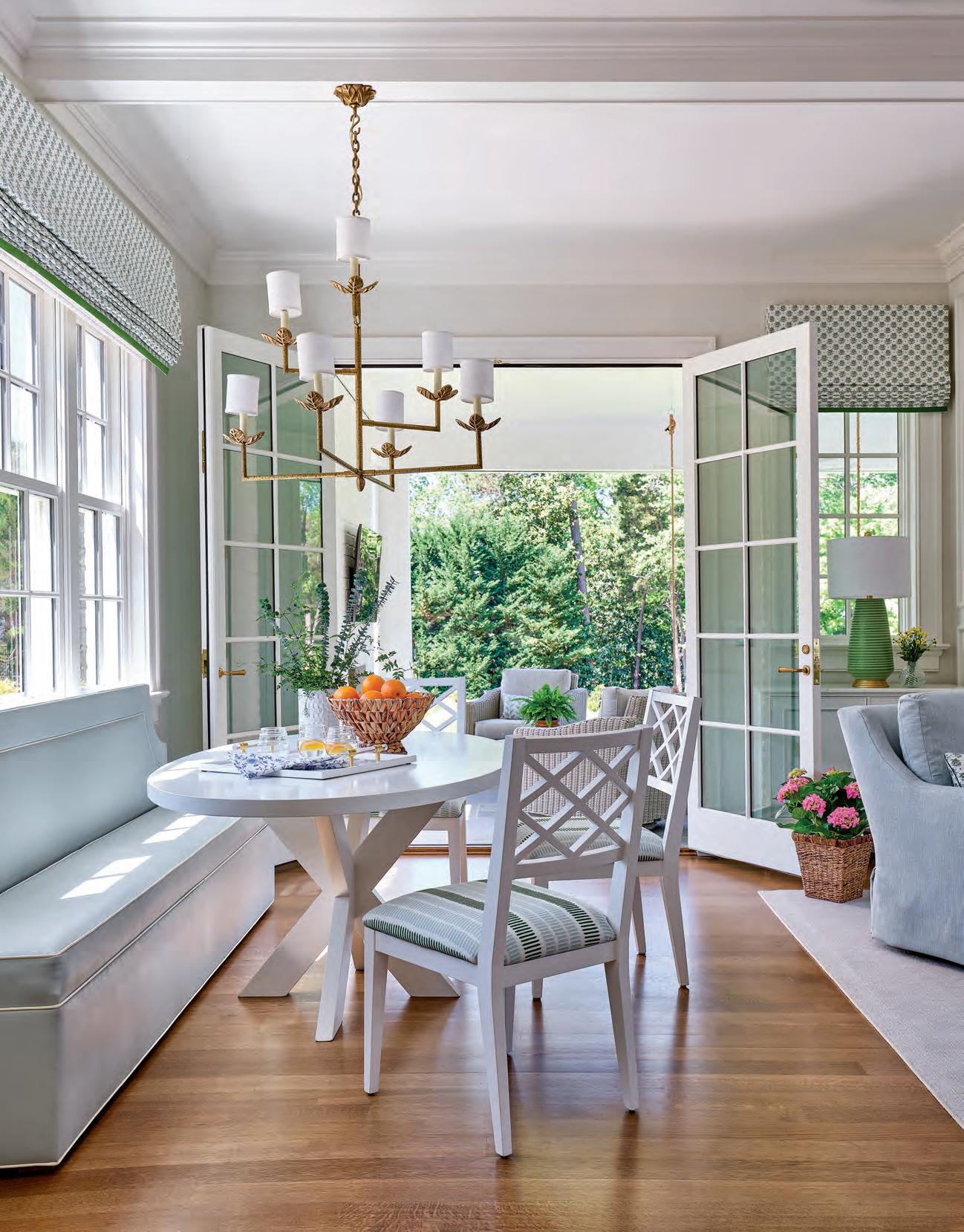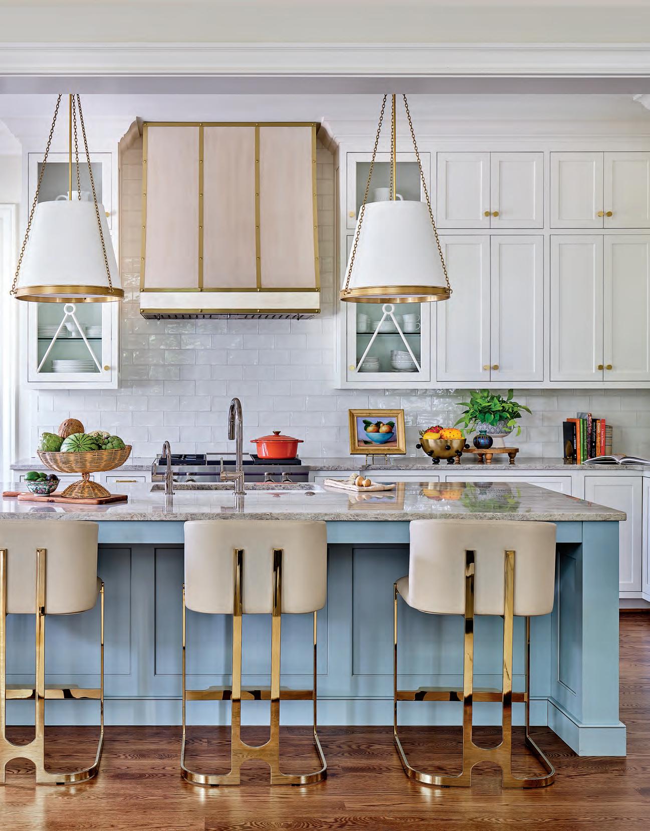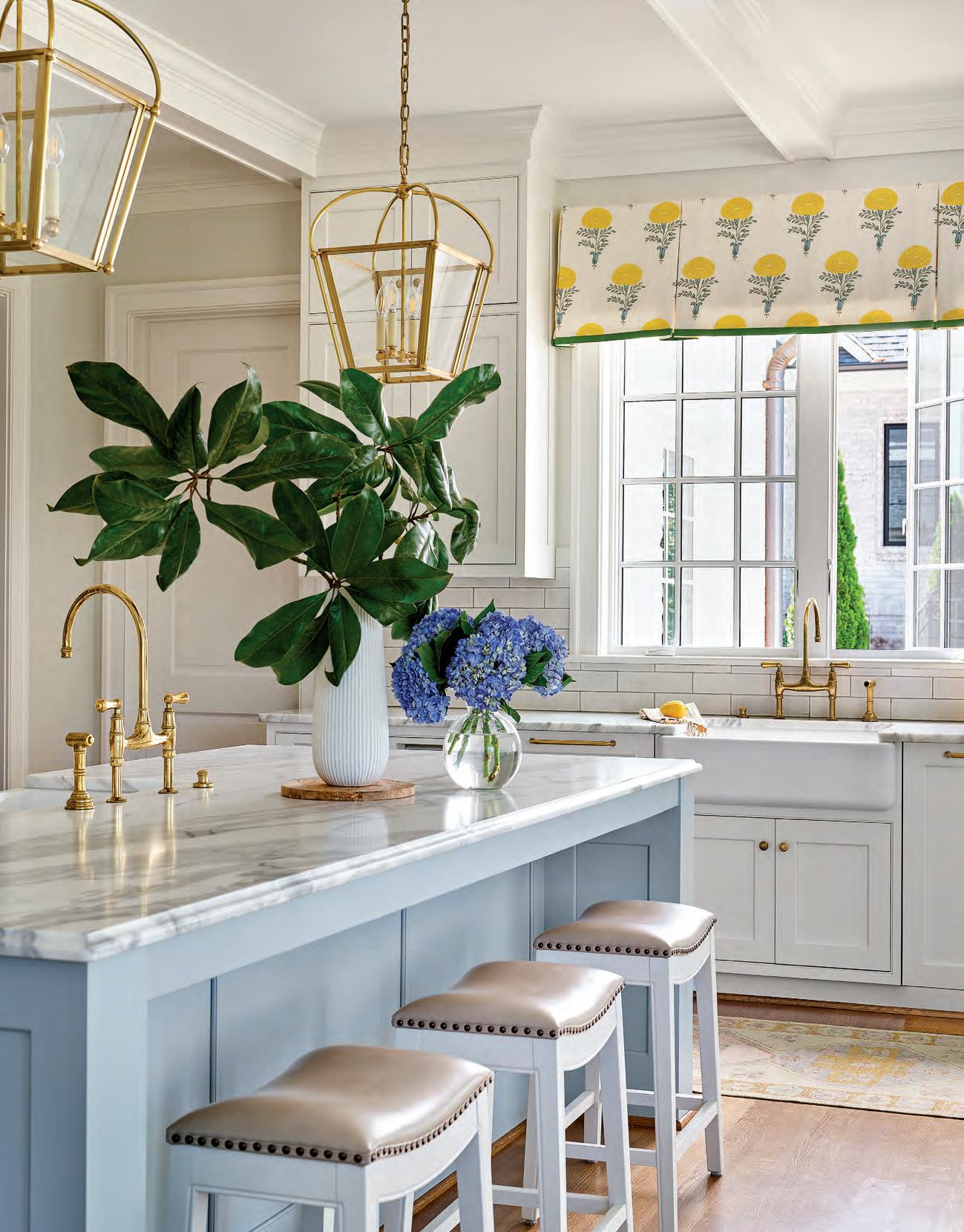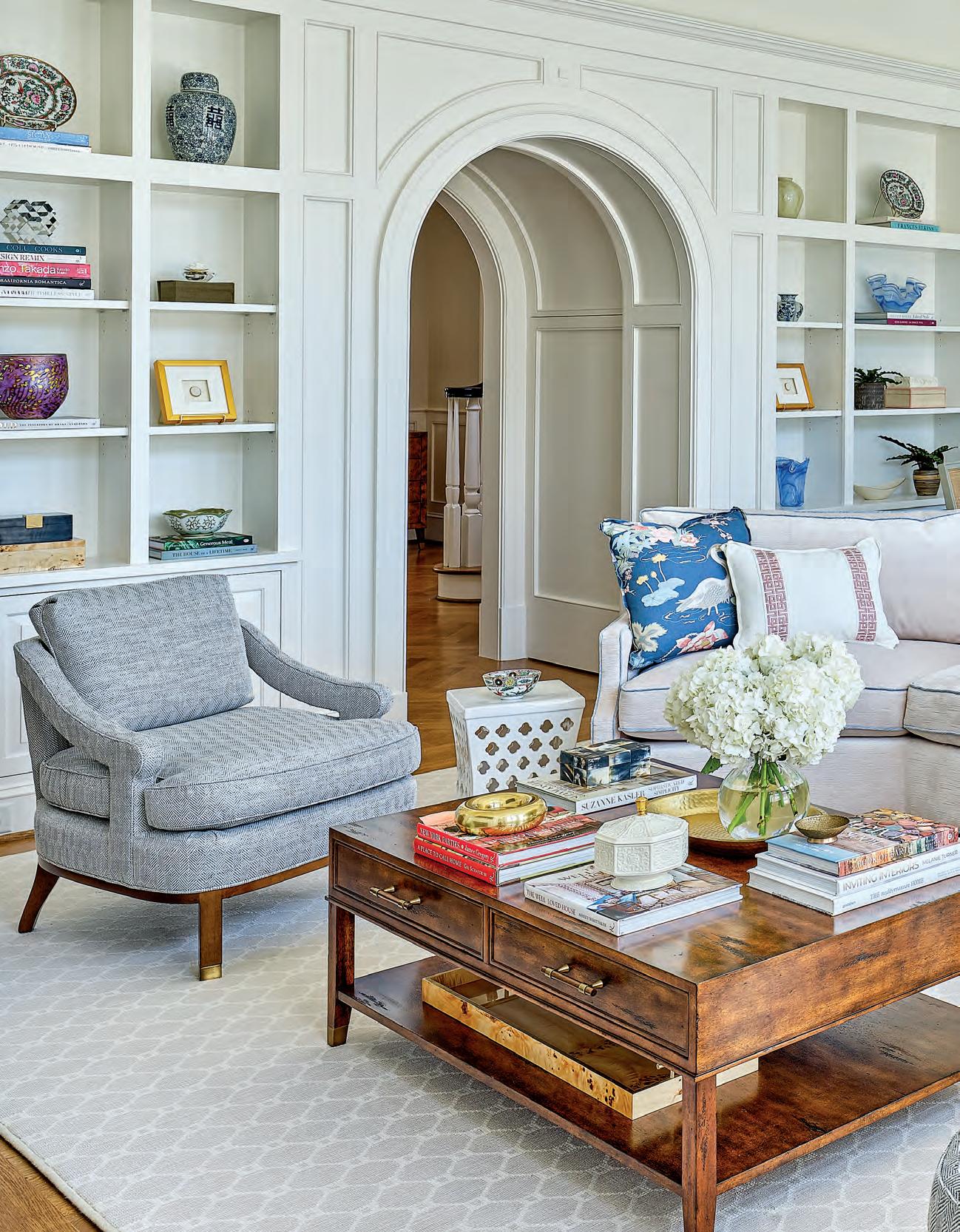 The interiors complement the traditional details, but Chapman “had to really bridge the gap between the formal and traditional the clients wanted with the functionality and comfortability of everyday life with a growing family,” he explains. “She had a very grand vision for the home and really appreciated that, but she also realized the need to be practical.” Adds the homeowner, “We wanted a traditional look, but a little bit more updated. We wanted a lot of color and everything to feel light and bright and open.”