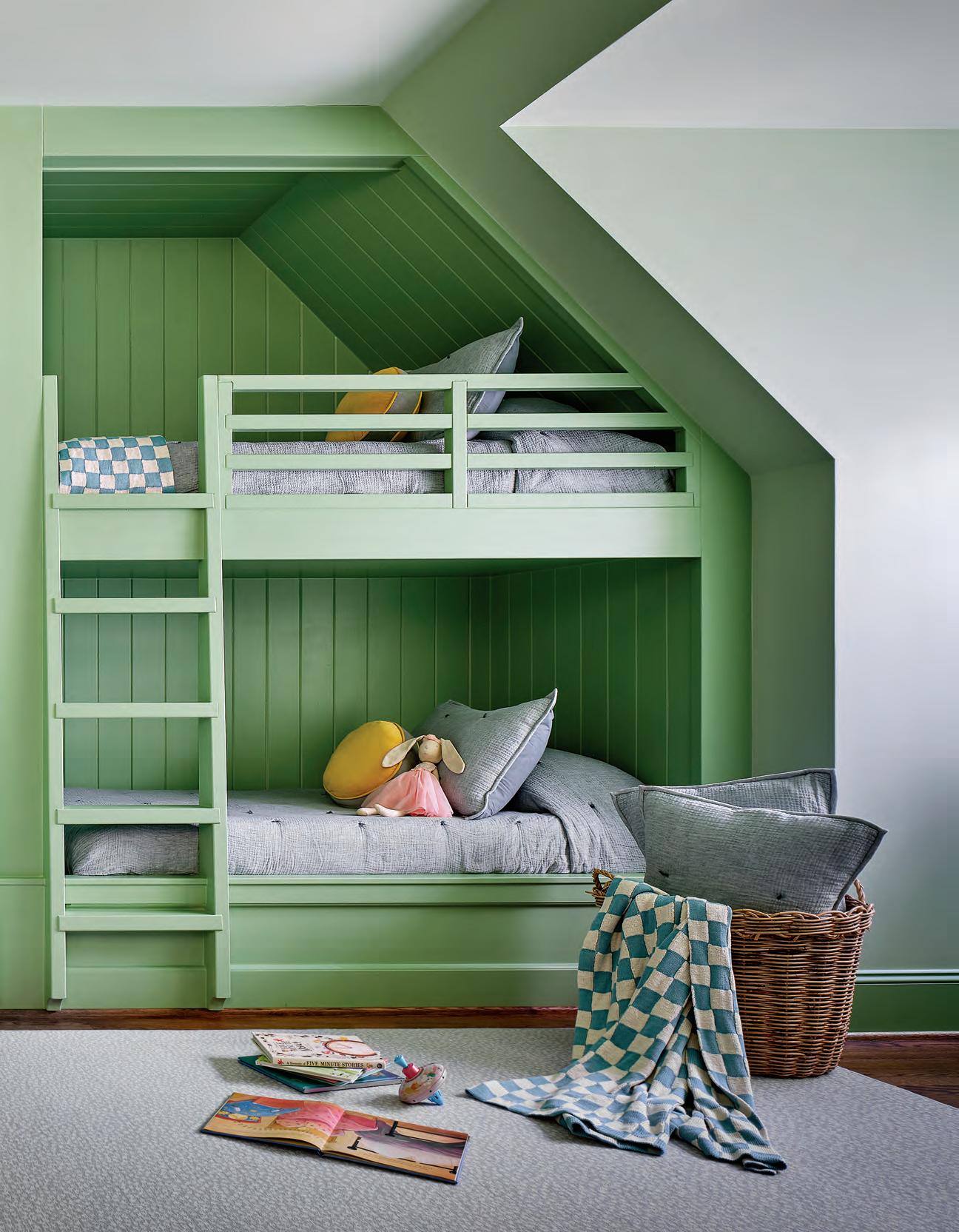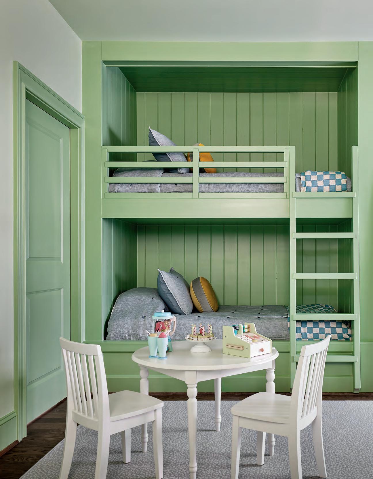 In the bunk-bed room, Cox painted the wood a gender-neutral green for the homeowners' six grandchildren.