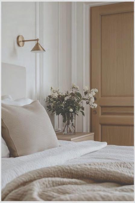 Sherry set the tone by selecting a nine-inch knotty oak floor, which runs throughout the house. She then added interest to a neutral palette by layering in a luxurious mix of textures and materials, from wooden tables to glass lamps to linen draperies. In the living room, a white plaster fireplace takes center stage, offset by a white gesso coffee table and a bleached silk-wool rug. The kitchen is also neutral-toned, with white quartz countertops and custom-built cabinetry in white. But the showstopper is arguably the dining room, where