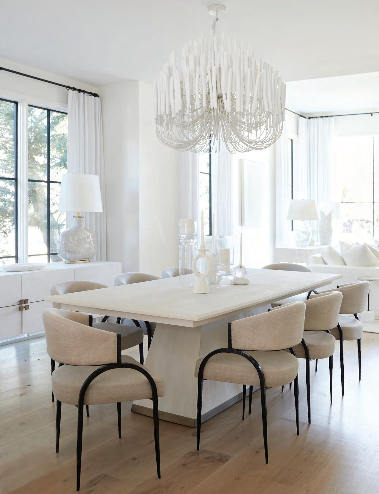 a multitiered chandelier hangs over the white cerused midcentury-modern table. “It took me a second to like the chandelier, but I trusted her, and now it’s one of my favorite things in the house,” says the homeowner.
