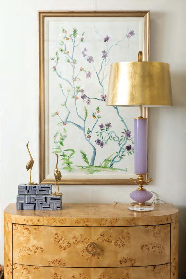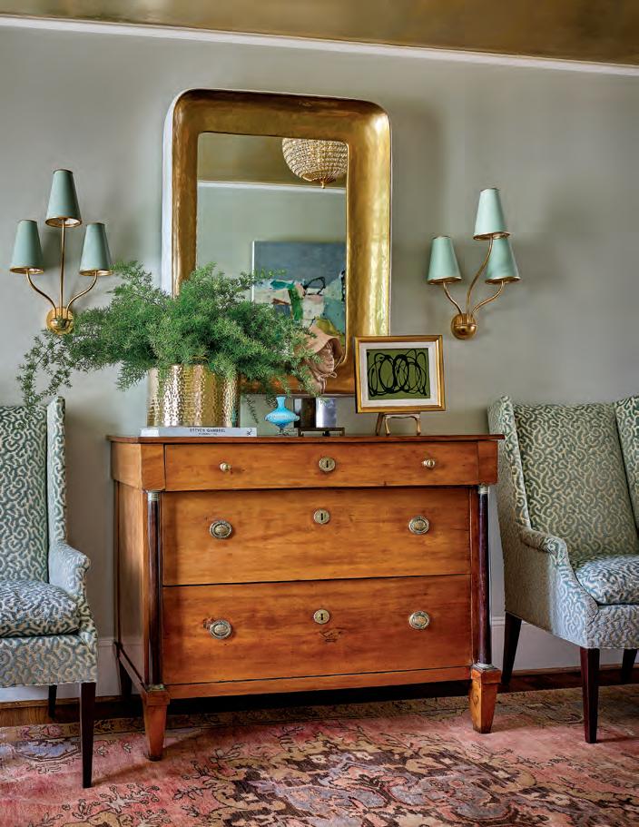 Another draw for Susan was Cox’s updated-but-classic aesthetic, one that marries antique furnishings with contemporary art. Cox took advantage of many of the homeowners’ antiques, including a chest of drawers and a nineteenth-century heirloom cabinet, as well as pieces from Susan’s modern art collection, which hang above the fireplace and in the entryway. “We used the colors from the paintings as inspiration,” says Cox.
