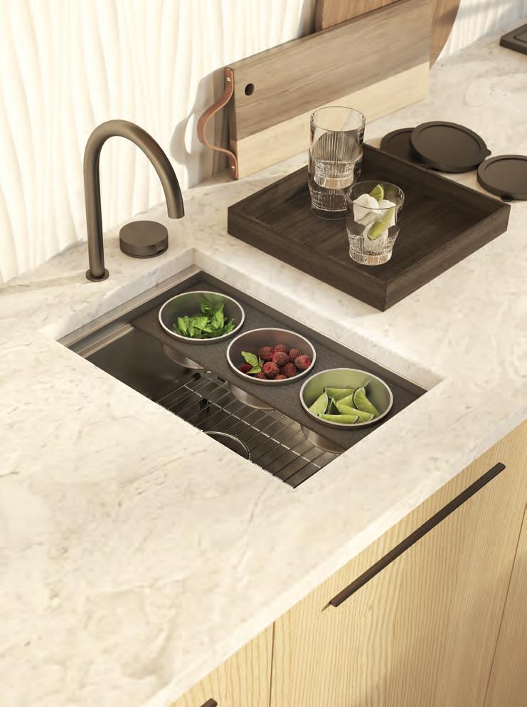 The showroom also carries outdoor-grade stainless steel sinks and workstations by Quebec-based Home Refinements Julien. Some homeowners find great value in new silgranit sinks—a mixture of natural and composite stones molded together to easily handle outdoor temperature fluctuations while maintaining their great looks and functionality.