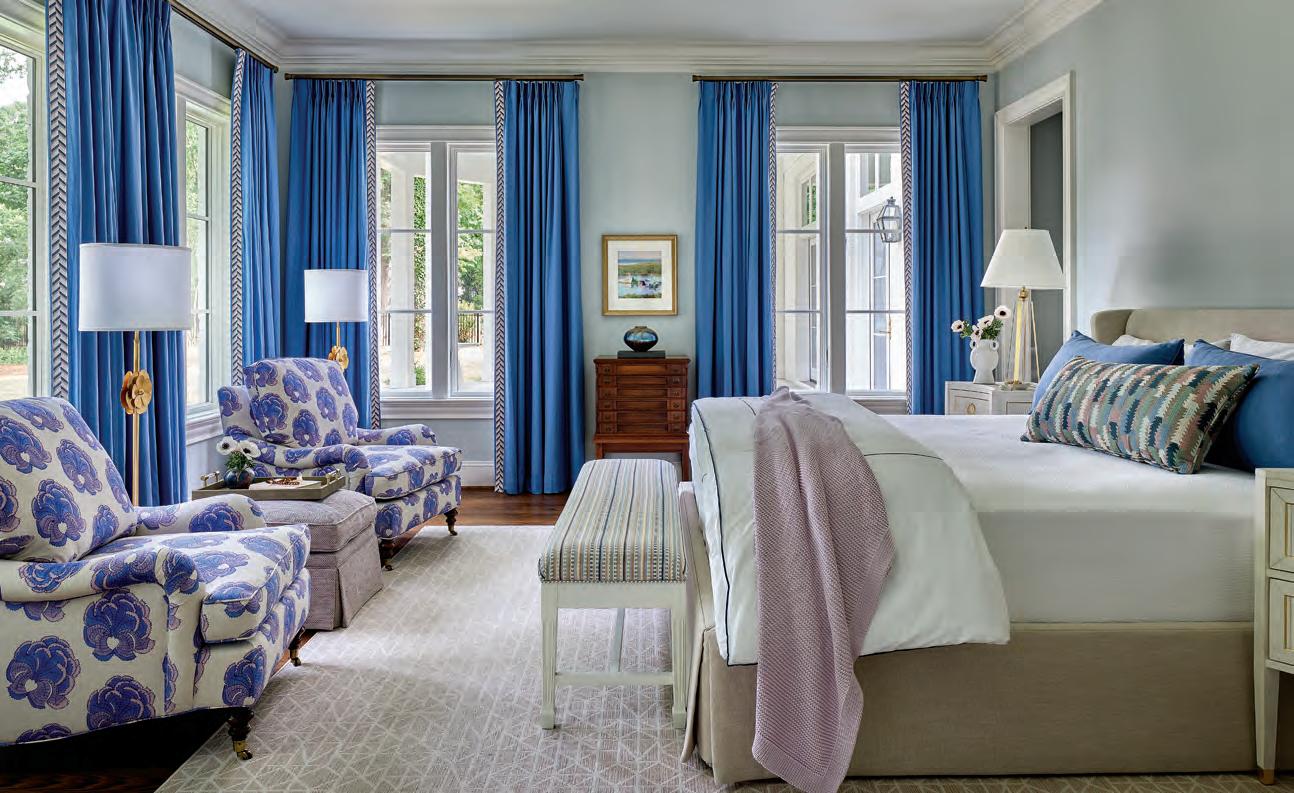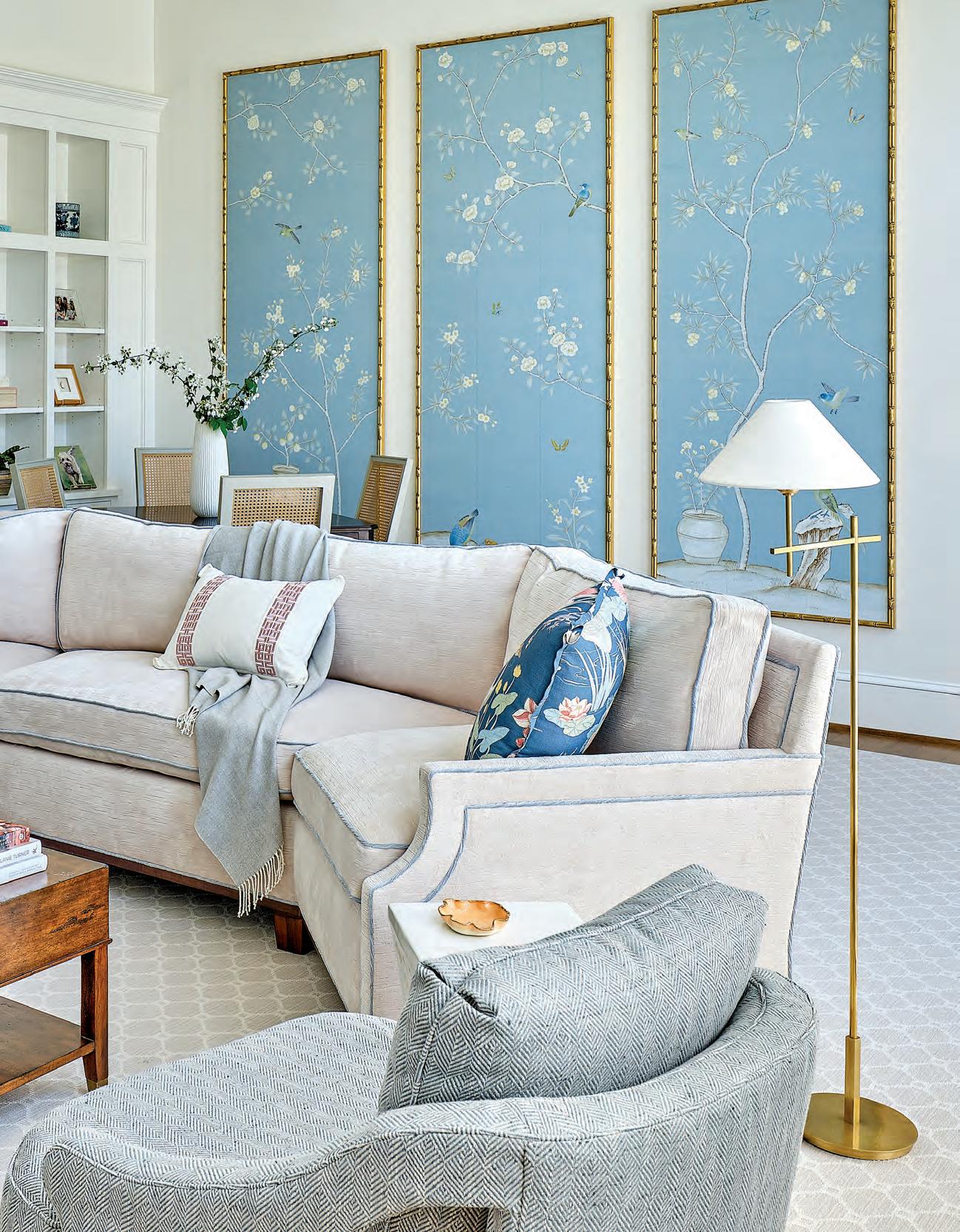 with a soft blue velvet by Pindler topped with a printed linen pillow, instantly injecting new life into the older piece. “It’s still a very traditional piece of furniture, but it suddenly feels more casual and fun with new upholstery,” says Chapman, who steered away from heavy, dark, and sometimes abrasive silks or wool blends to keep things light and soft to the touch.
