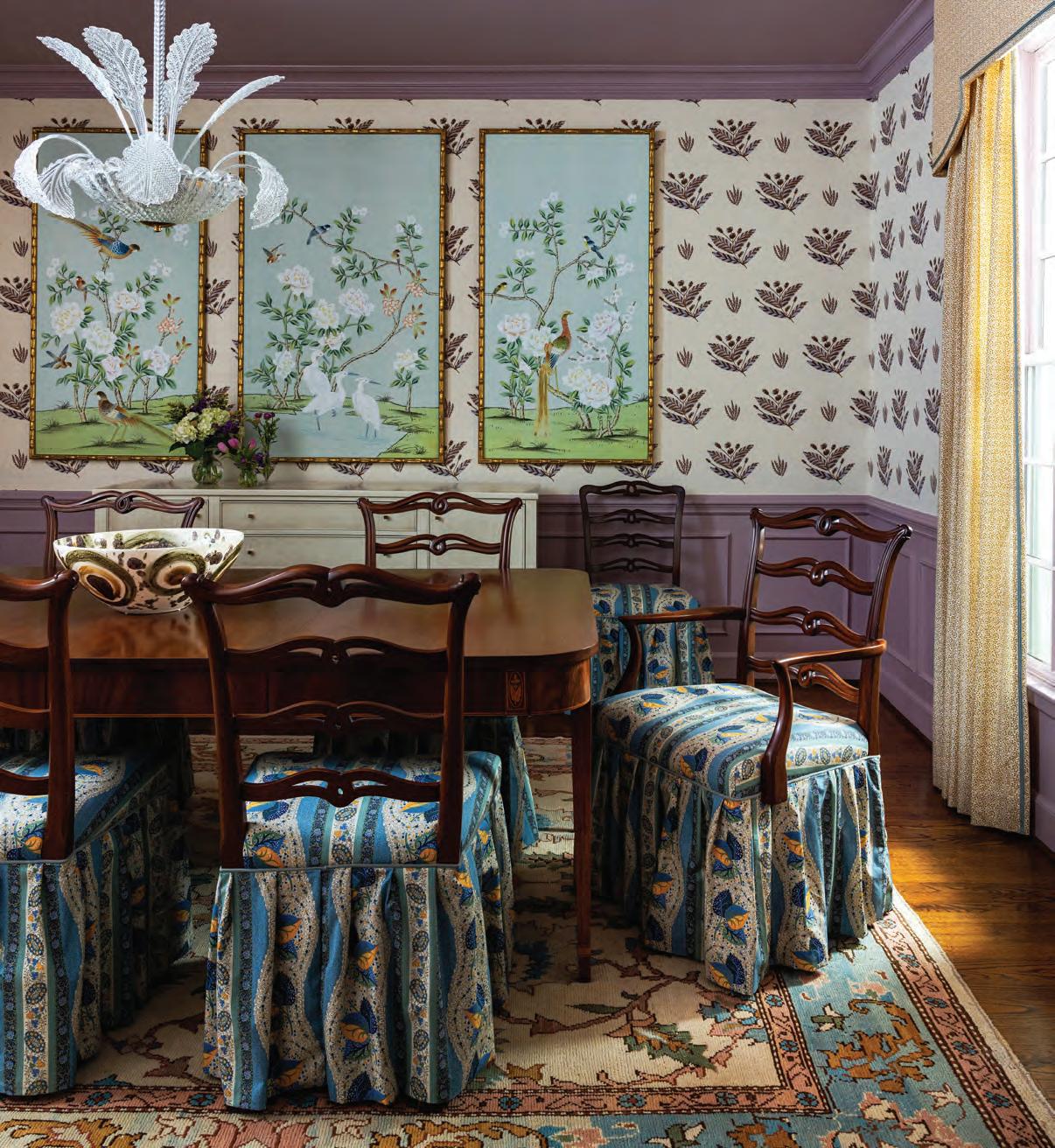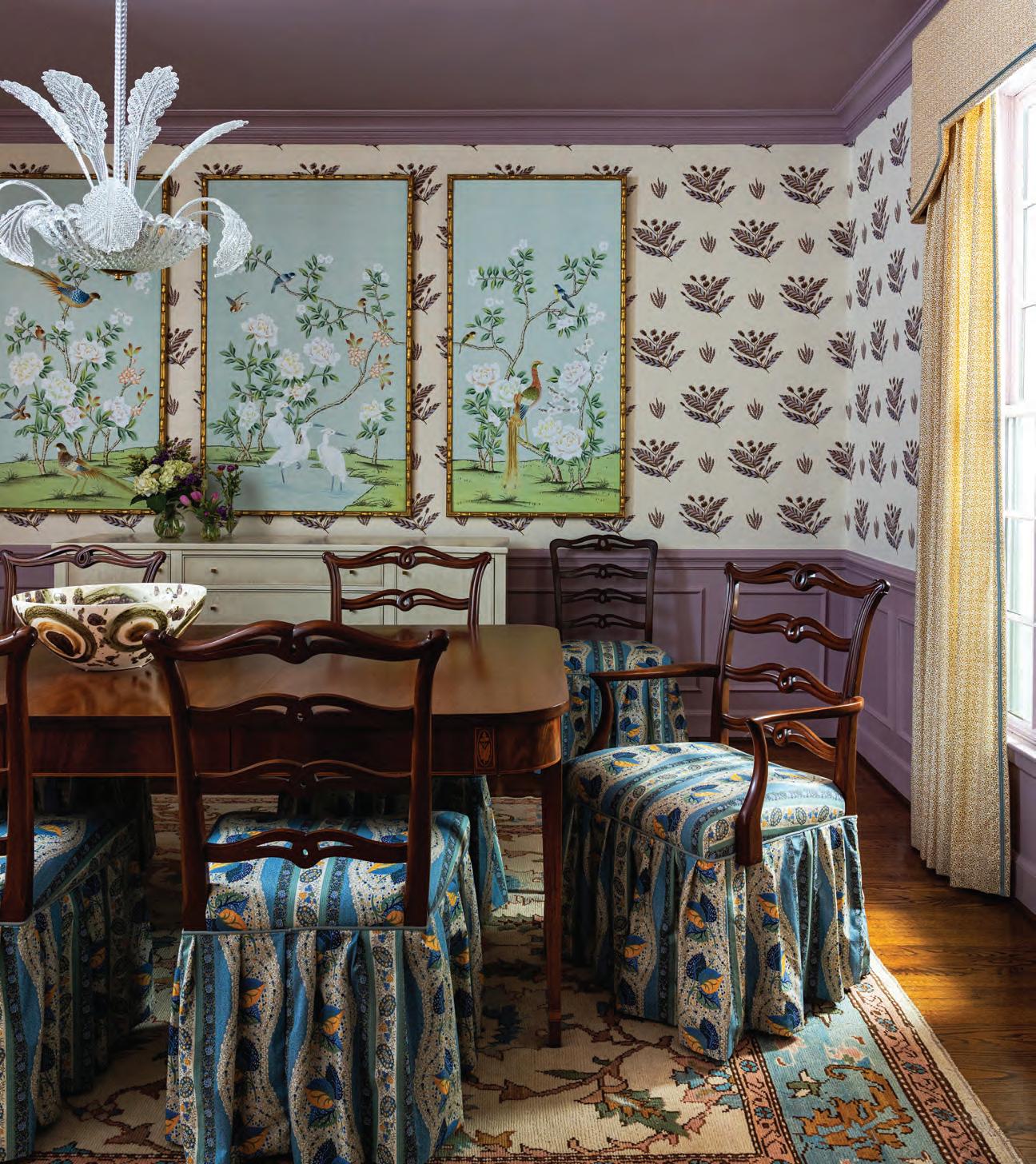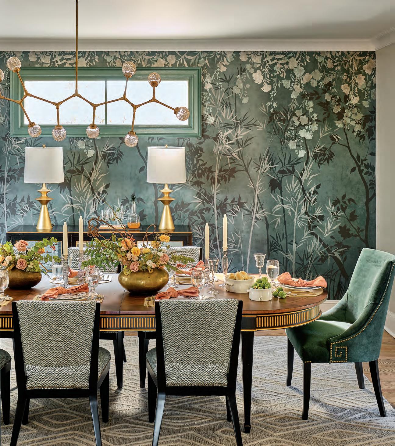 Designed by Vicky Serany and Southern Studio, this stunning dining room was always intended to make a statement—a priority for this color-and-entertaining-loving couple. The evocative wall mural anchors the space and creates a beautiful and relaxed environment for hosting dinners.