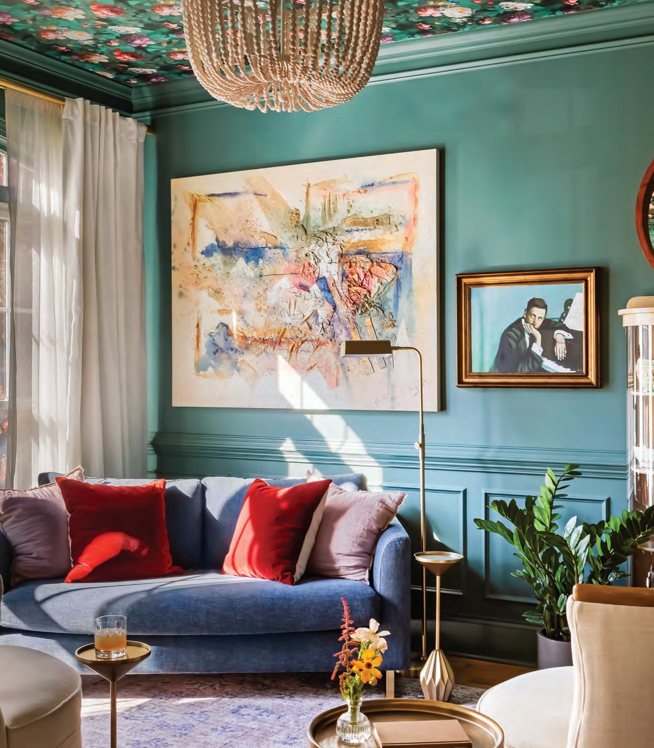 “The papered ceiling and deep wall color envelop you and make you want to linger in this room.”