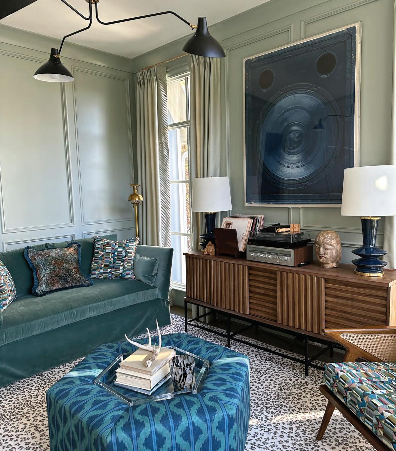 “This room is a cozy spot to enjoy the extensive vinyl collection while gathering around the cocktail ottoman for drinks and conversation.”