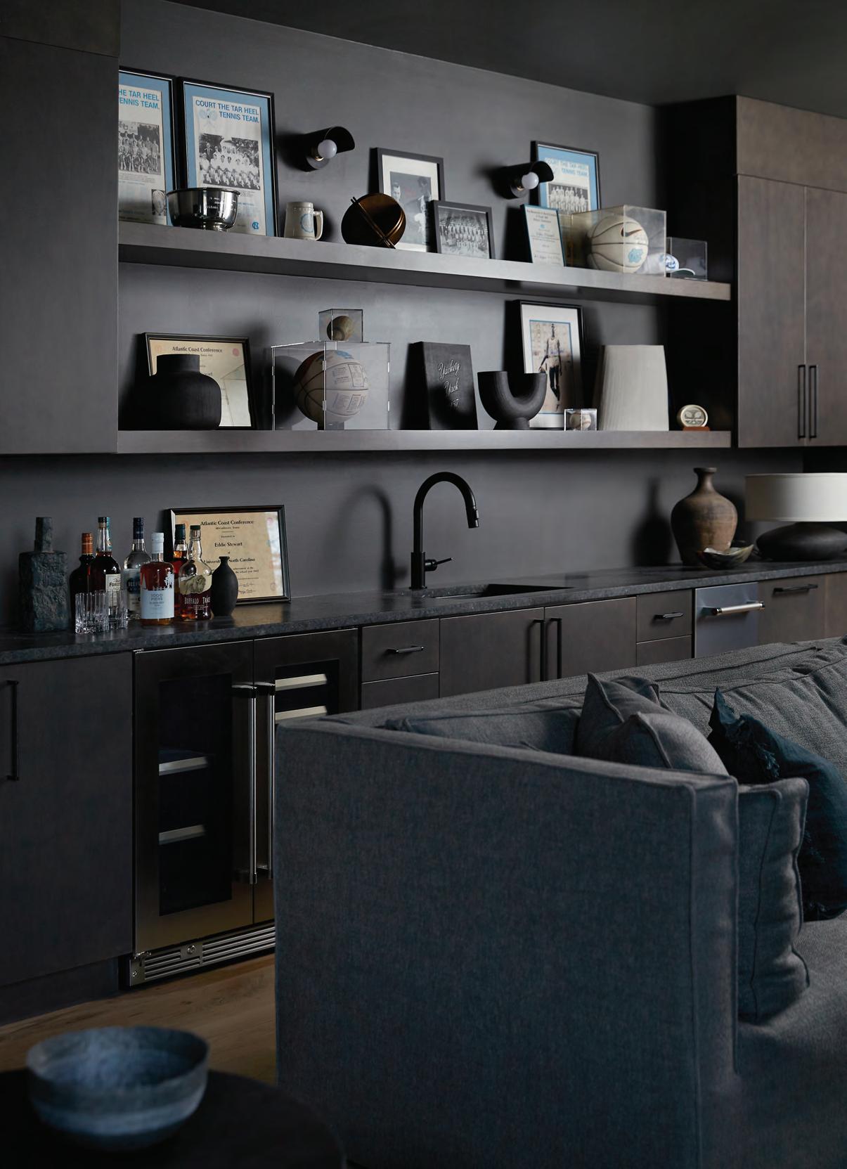 One room of the house, though, was infused with a bold, dark palette: the Stewarts’ media room. “It was a departure from the overall light, bright aesthetic of the rest of the home,” says Sherry. There, the homeowners watch football on the two large televisions. A custombuilt wet bar, with built-in shelves, hosts a collection of sports memorabilia—many of the items autographed by famous athletes, such as Peyton Manning.