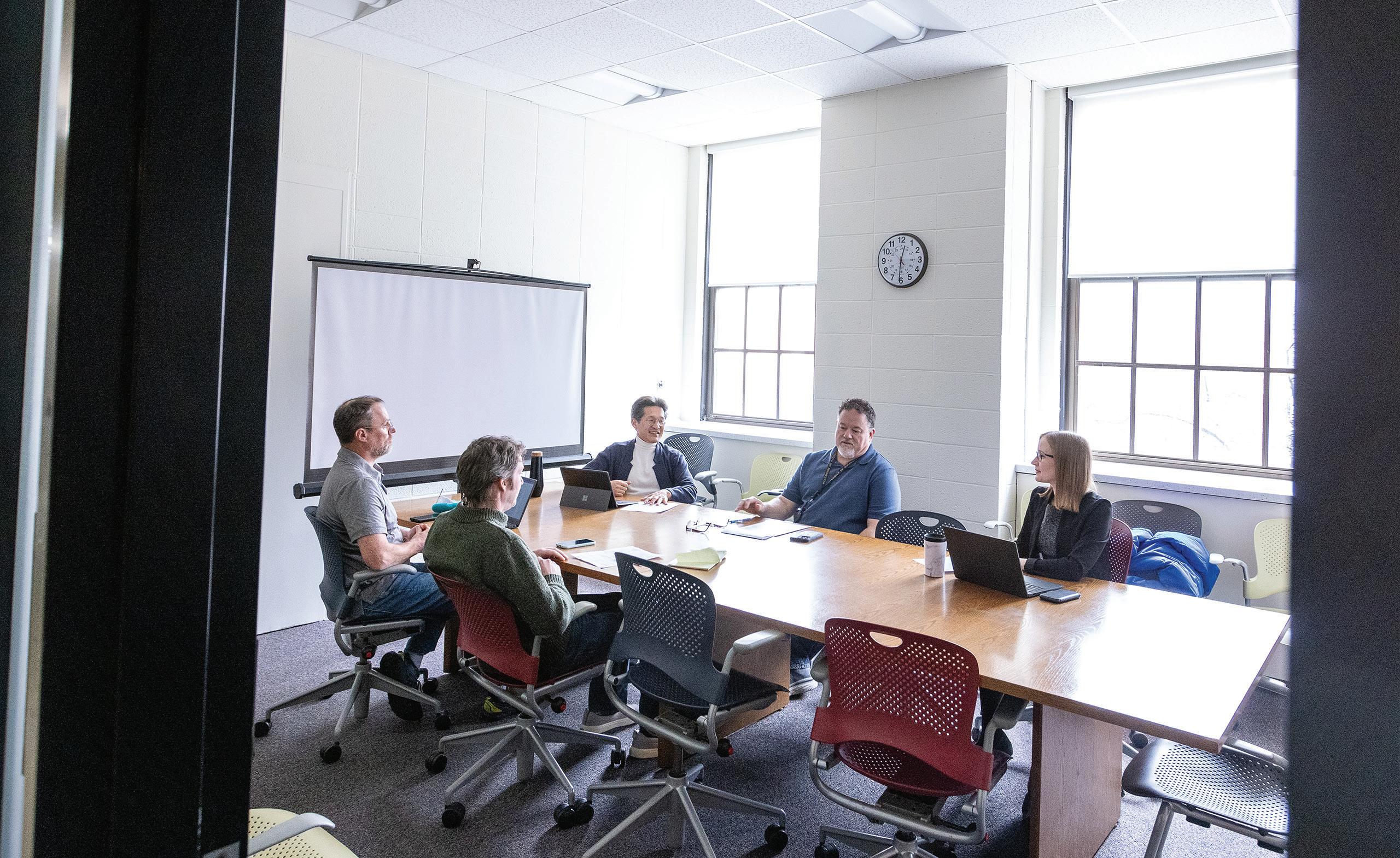 Grant writing group meets weekly on the University of Rochester campus. From front left: Eric Anson, PhD, Kenneth Henry, PhD. From back left: Jong-Hoon Nam, PhD, J. Chris Holt, PhD, Sarah Hayes, AuD, PhD.