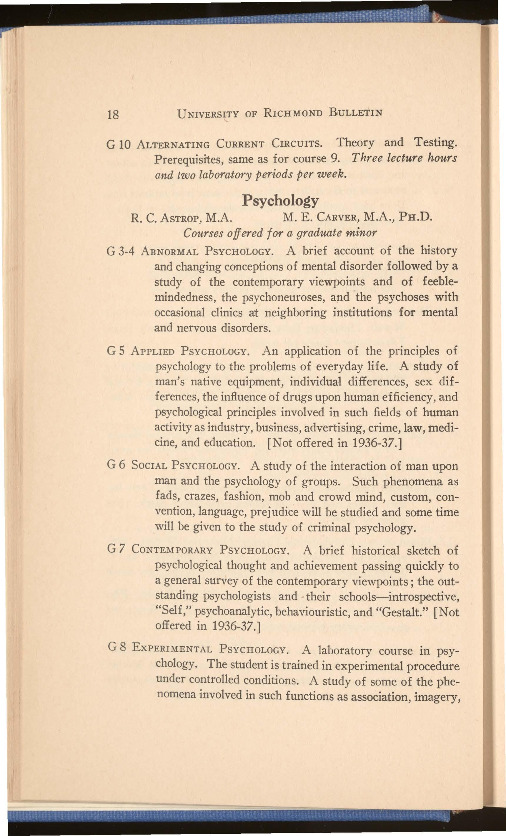 G 5 APPLIEDPSYCHOLOGY.An application of the principles of psychology to the problems of everyday life. A study of man's native equipment, individual differences, sex differences, the influence of drugs upon human efficiency, and psychological principles involved in such fields of human activity as industry, business, advertising, crime, law, medicine, and education. [Not offered in 1936-37.]