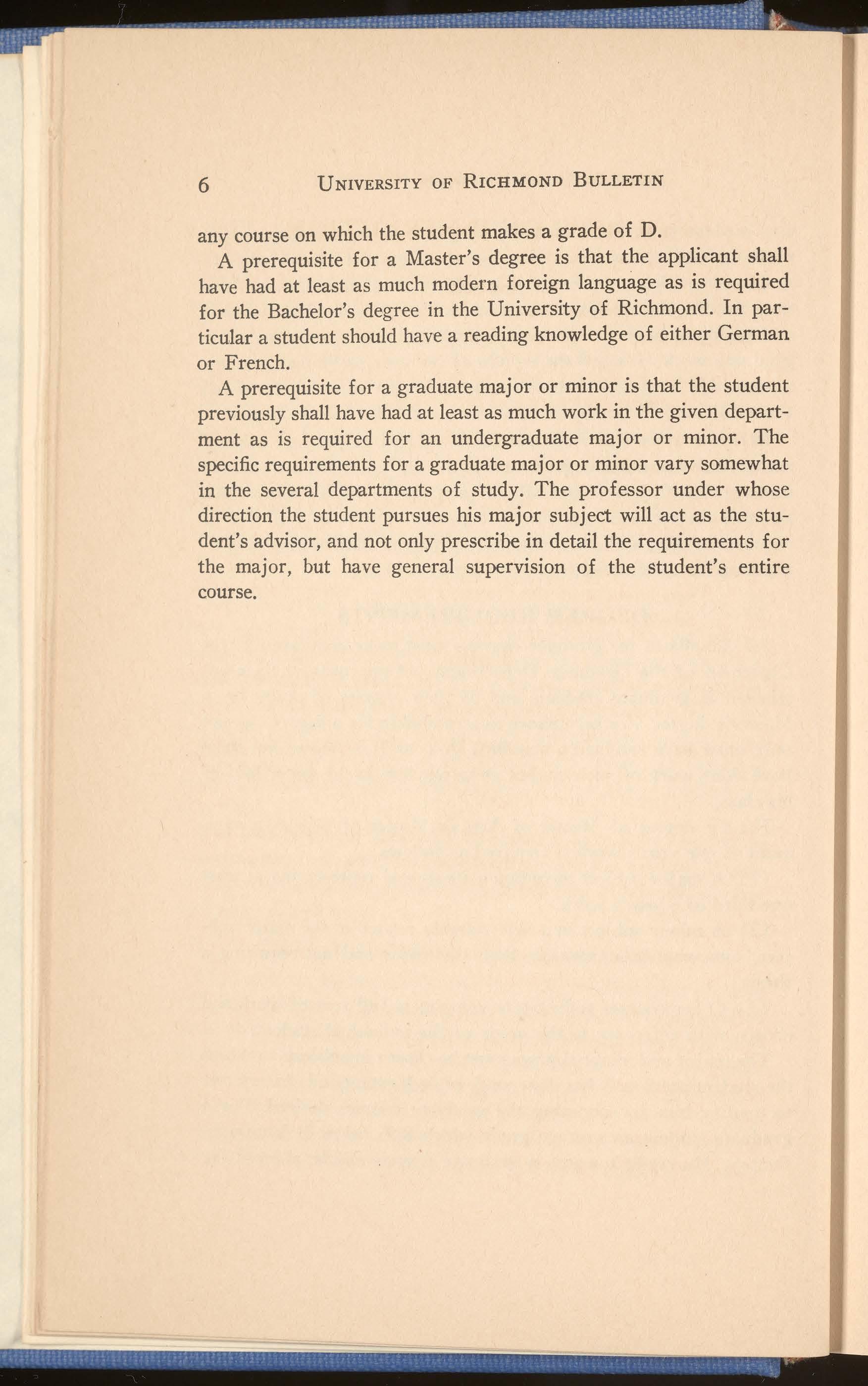A prerequisite for a Master's degree is that the applicant shall have had at least as much modern foreign language as is required for the Bachelor's degree in the University of Richmond. In particular a student should have a reading knowledge of either German or French.