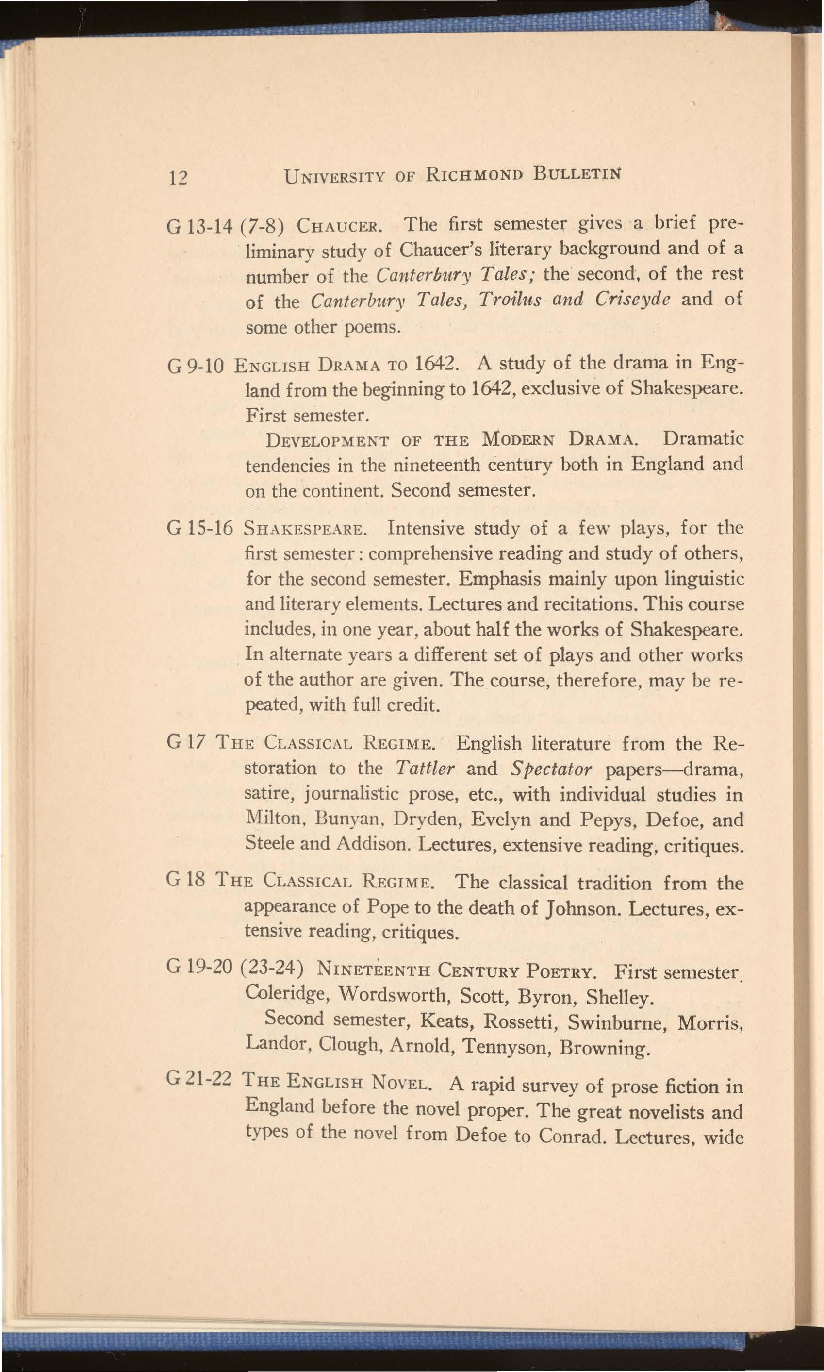 G 13-14 (7-8) CHAUCER. The first semester gives a brief preliminary study of Chaucer's literary background and of a number of the Canterbury Tales; the second, of the rest of the Canterbury Tales, Troiltts and Criseyde and of some other poems.