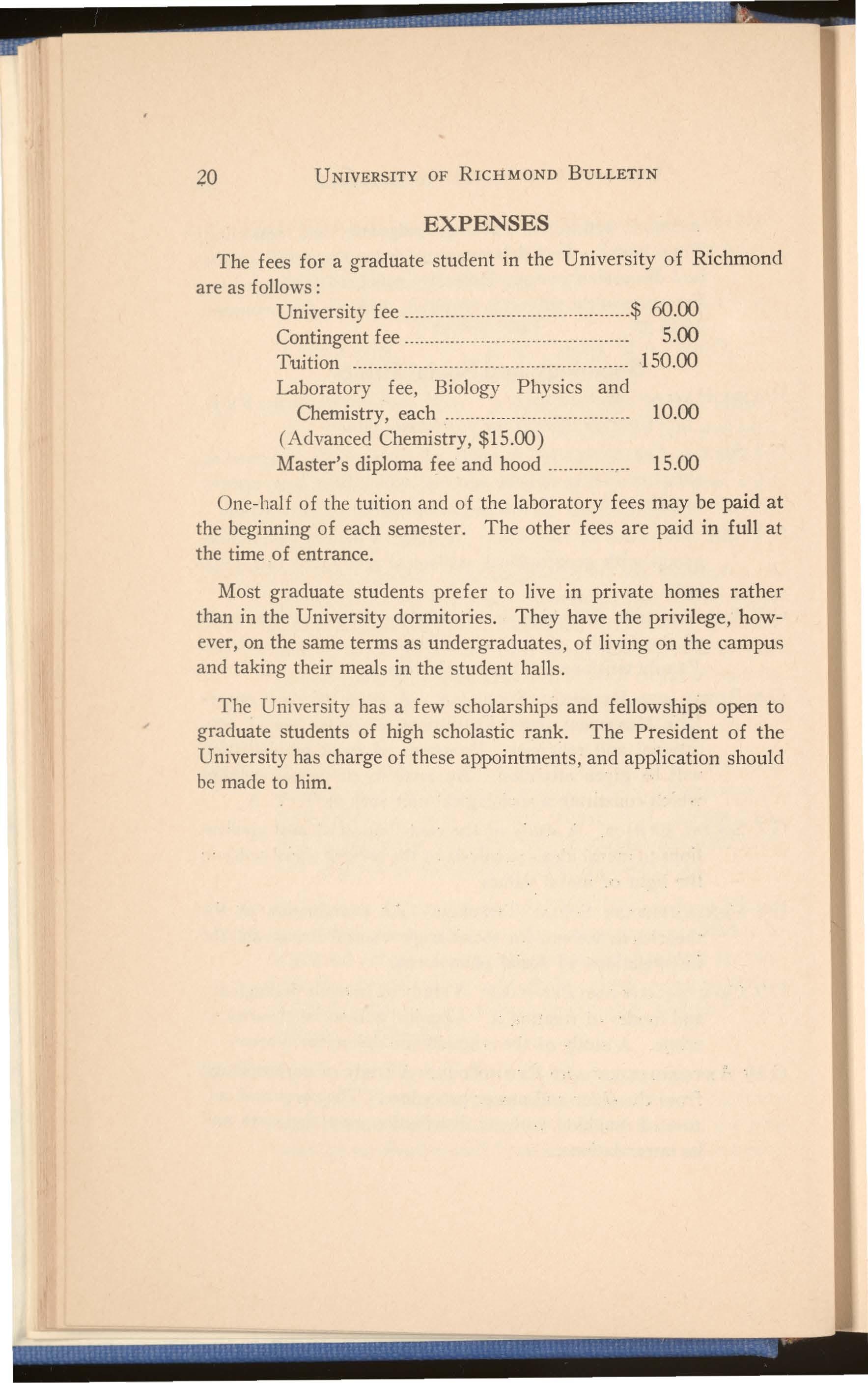 The fees for a graduate student in the University of Richmond are as follows : University fee .... ........................................$ 60 .00 Contingent fee... ........................................ . 5.00 Tuition .................................. ............ ........ 150.00