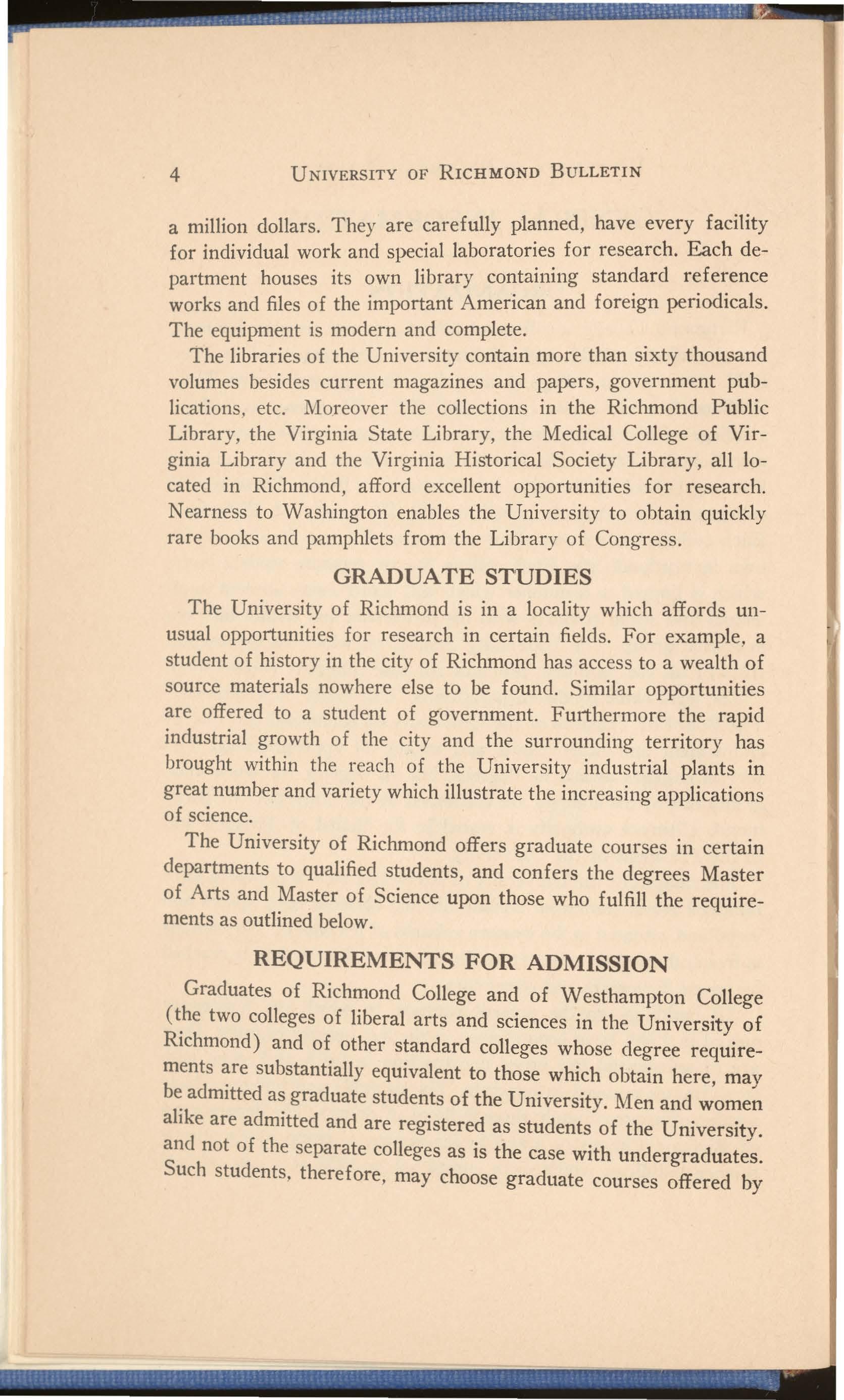 Graduates of Richmond College and of Westhampton College (the two colleges of liberal arts and sciences in the University of Richmond) and of other standard colleges whose degree requirements are substantially equivalent to those which obtain here, may be admitted as graduate students of the University. Men and women alike are admitted and are registered as students of the University. and not of the separate colleges as is the case with undergraduates. Such students, therefore, may choose graduate courses offered by