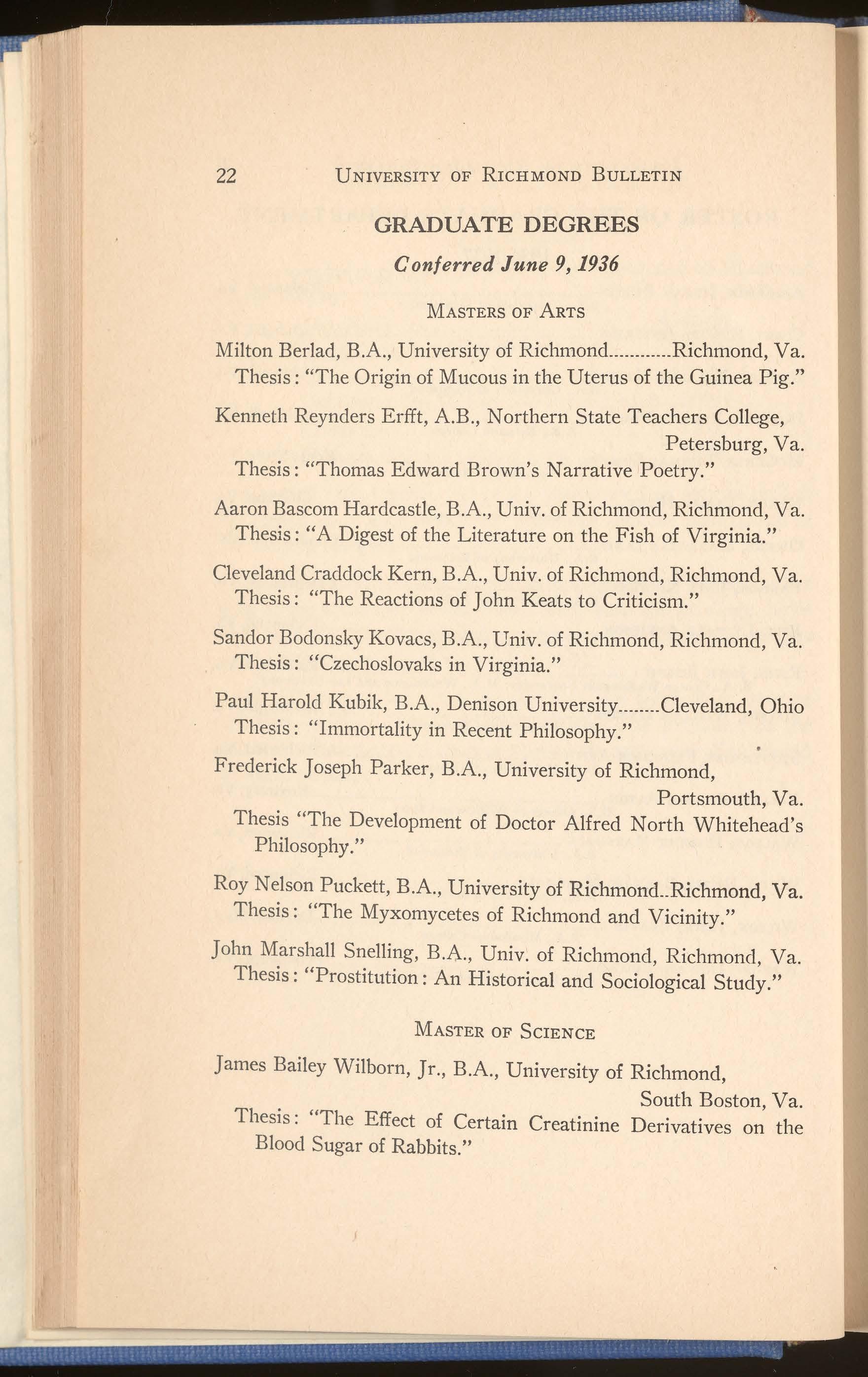 James Bailey Wilborn, Jr., B.A., University of Richmond, South Boston, Va. Thesis : "The Effect of Certain Creatinine Derivatives on the Blood Sugar of Rabbits."