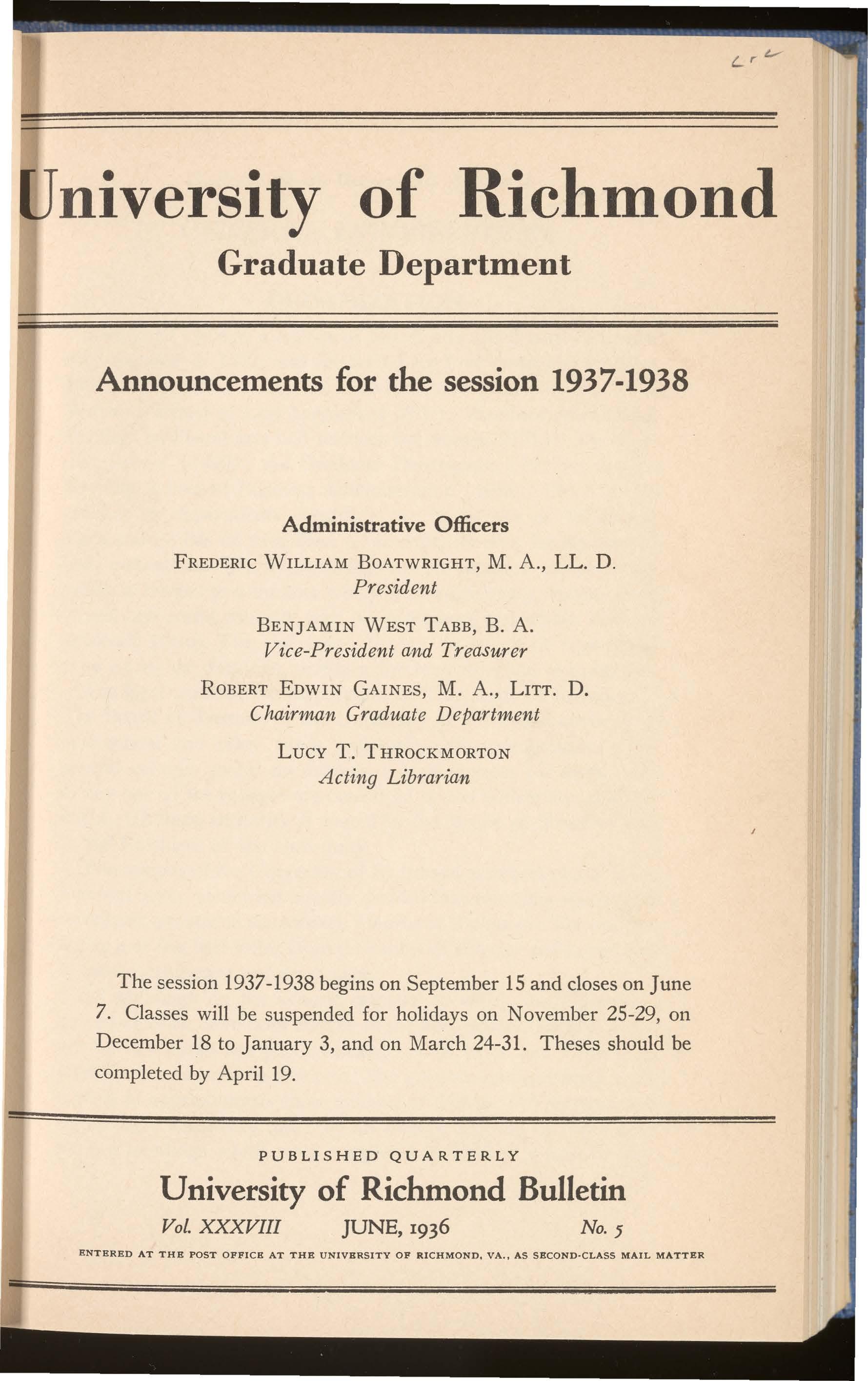 The session 1937-1938 begins on September 15 and closes on June 7. Classes will be suspended for holidays on November 25-29, on December 18 to January 3, and on March 24-31. Theses should be completed by April 19. PUBLISHED QUARTERLY