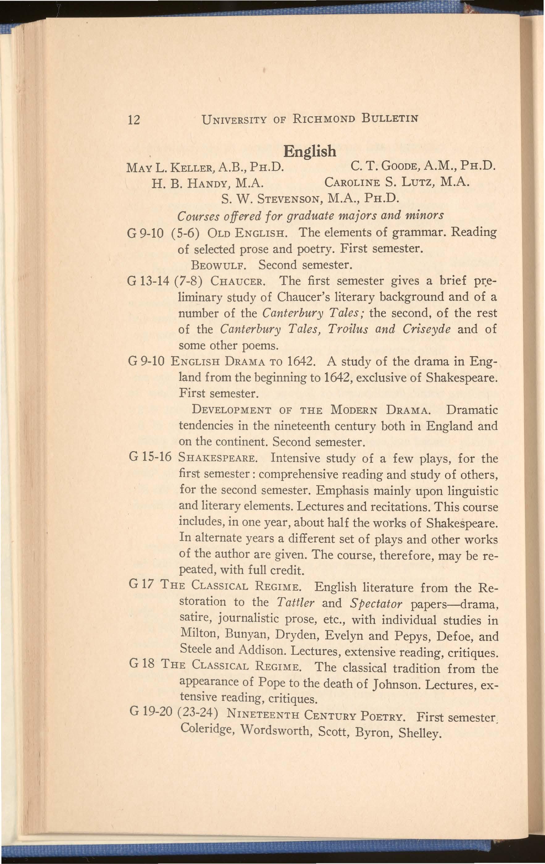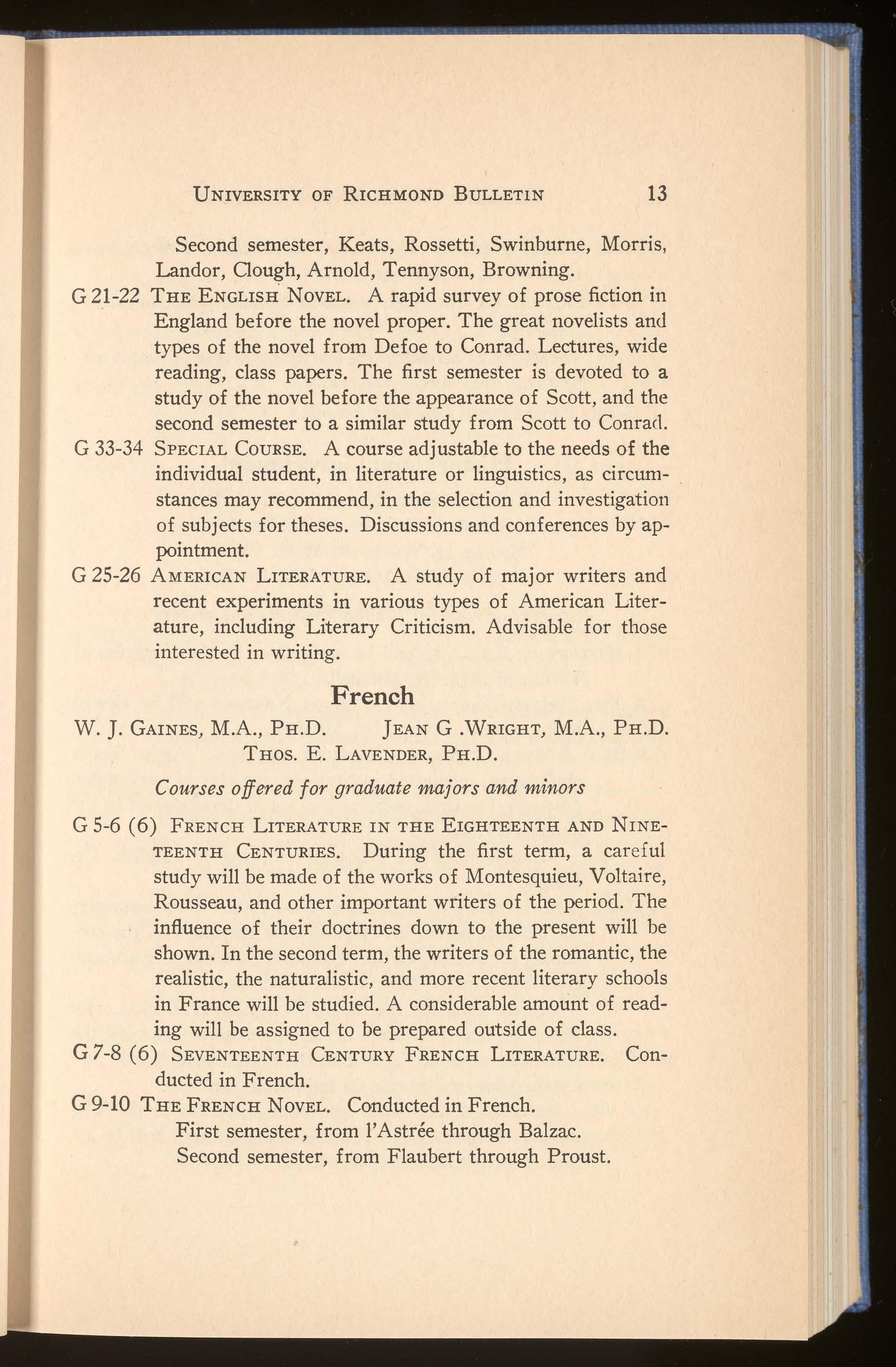 A prerequisite for a Master's degree is that the applicant shall have had at least as much modern foreign language as is required for the Bachelor's degree in the University of Richmond. In particular a student should have a reading knowledge of either German or French.