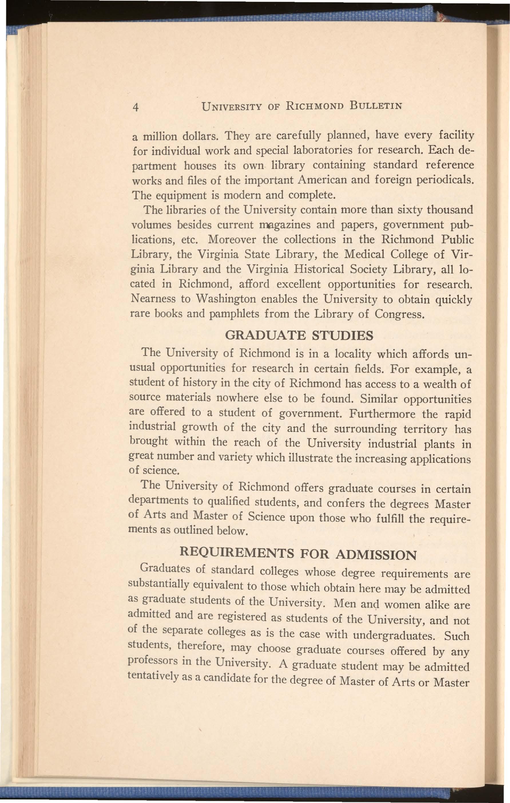 The libraries of the University contain more than sixty thousand volumes besides current tnlgazines and papers, government publications, etc. Moreover the collections in the Richmond Public Library, the Virginia State Library, the Medical College of Virginia Library and the Virginia Historical Society Library, all located in Richmond, afford excellent opportunities for research. Nearness to Washington enables the University to obtain quickly rare books and pamphlets from the Library of Congress.