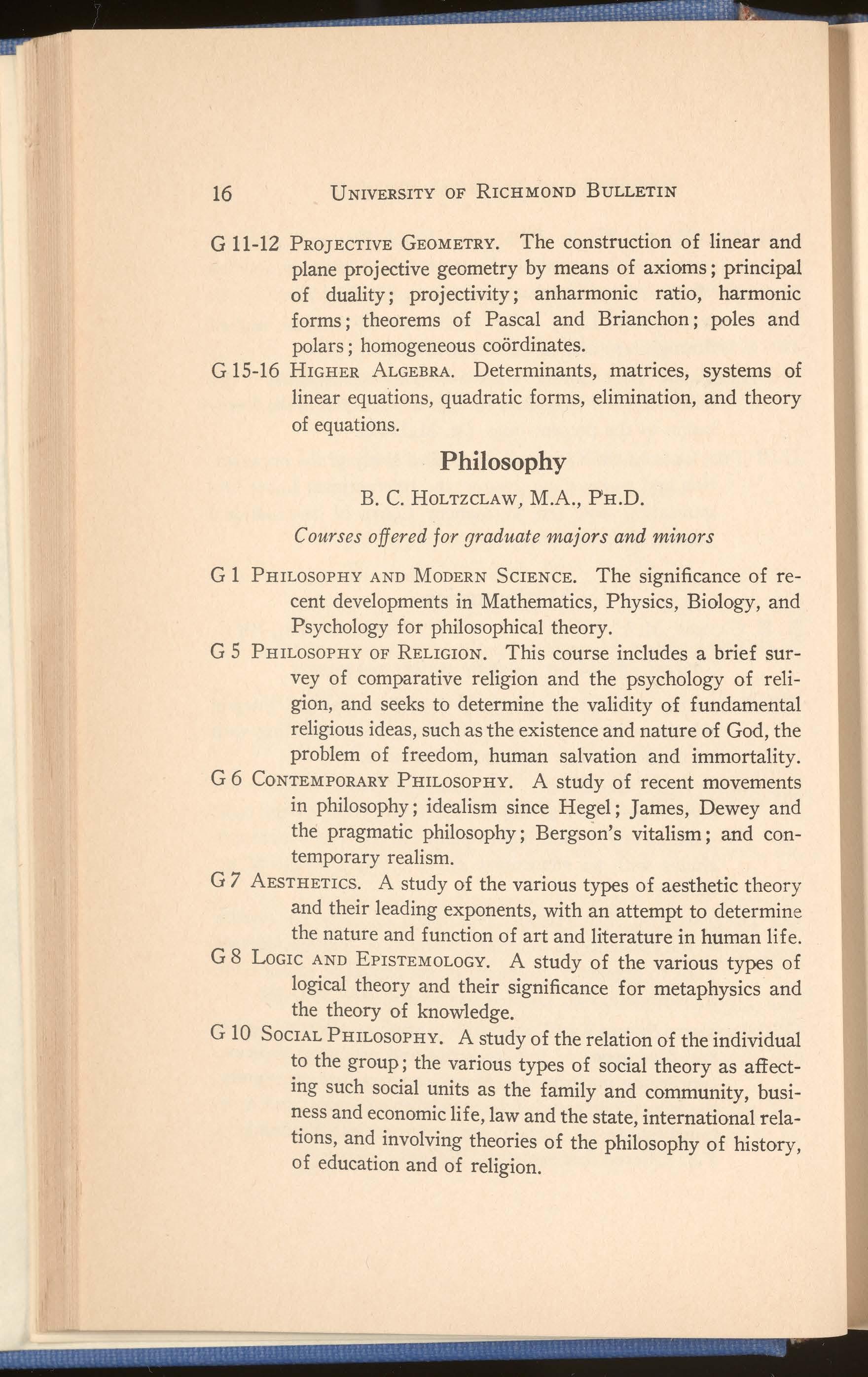 G 6 CONTEMPORARYPHILOSOPHY. A study of recent movements in philosophy; idealism since Hegel; James, Dewey and the pragmatic philosophy; Bergson's vitalism; and contemporary realism.