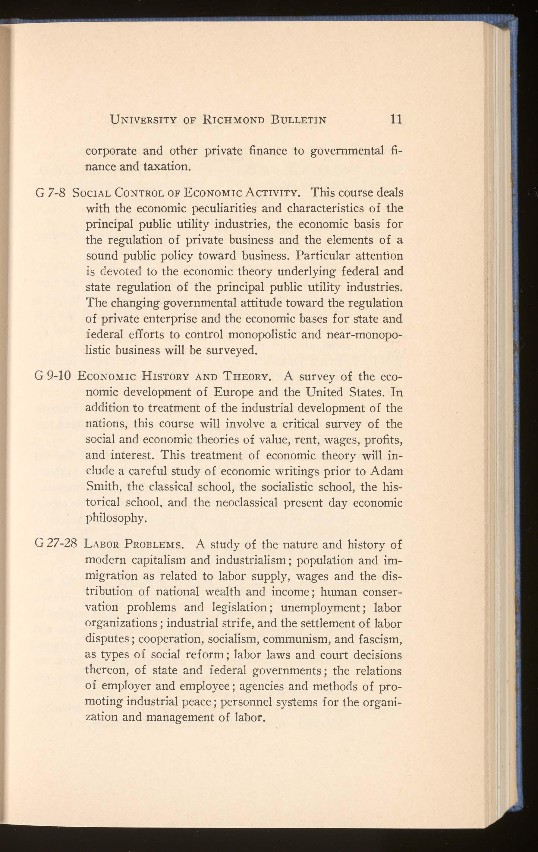 G 9-10 ECONOMICHISTORYAND THEORY. A survey of the economic development of Europe and the United States. In addition to treatment of the industrial development of the nations, this course will involve a critical survey of the social and economic theories of value, rent, wages, profits, and interest. This treatment of economic theory will include a careful study of economic writings prior to Adam Smith, the classical school, the socialistic school, the historical school, and the neoclassical present day economic philosophy.