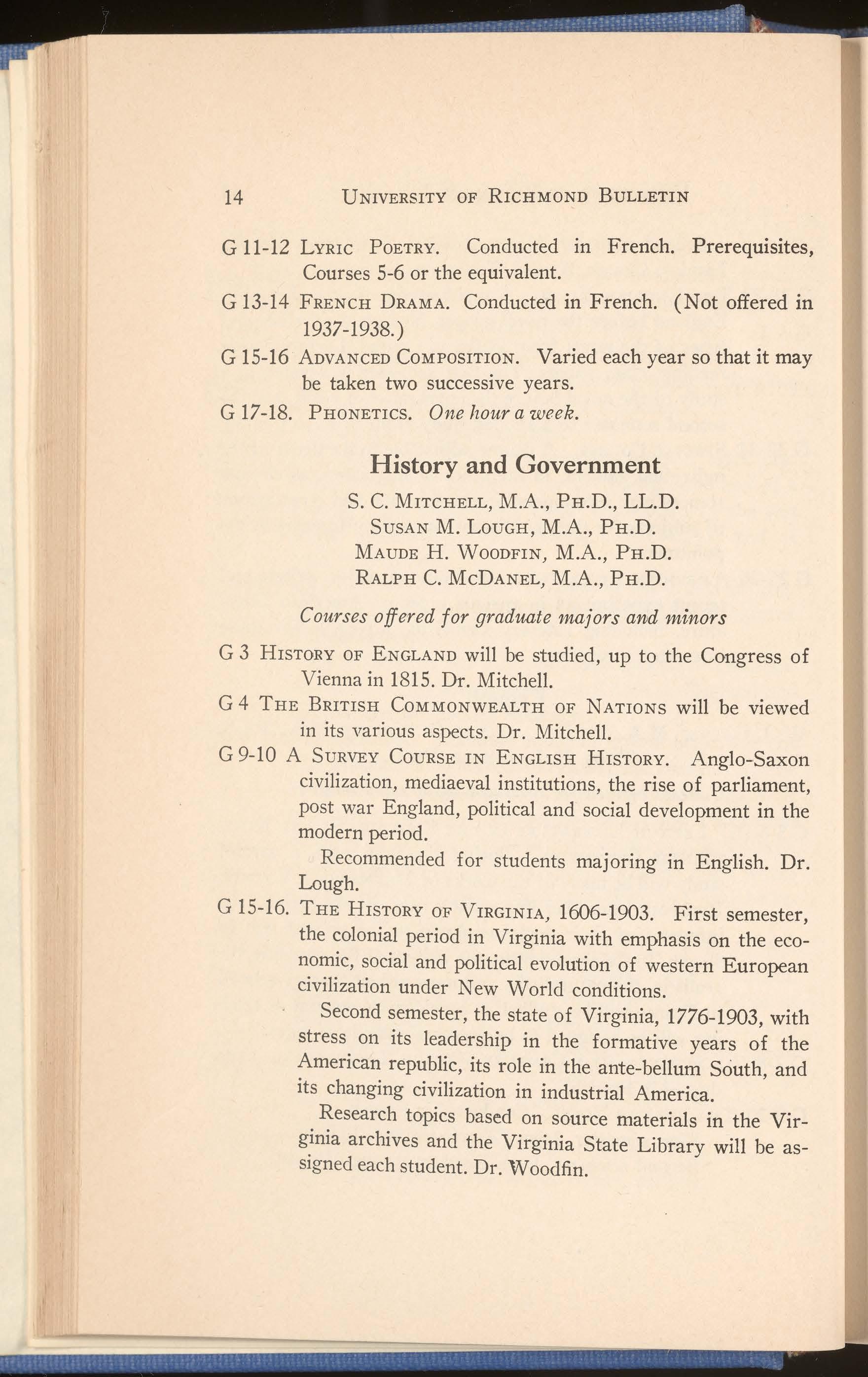 Second semester, the state of Virginia, 1776-1903, with stress on its leadership in the formative years of the American republic, its role in the ante-bellum South, and its changing civilization in industrial America.