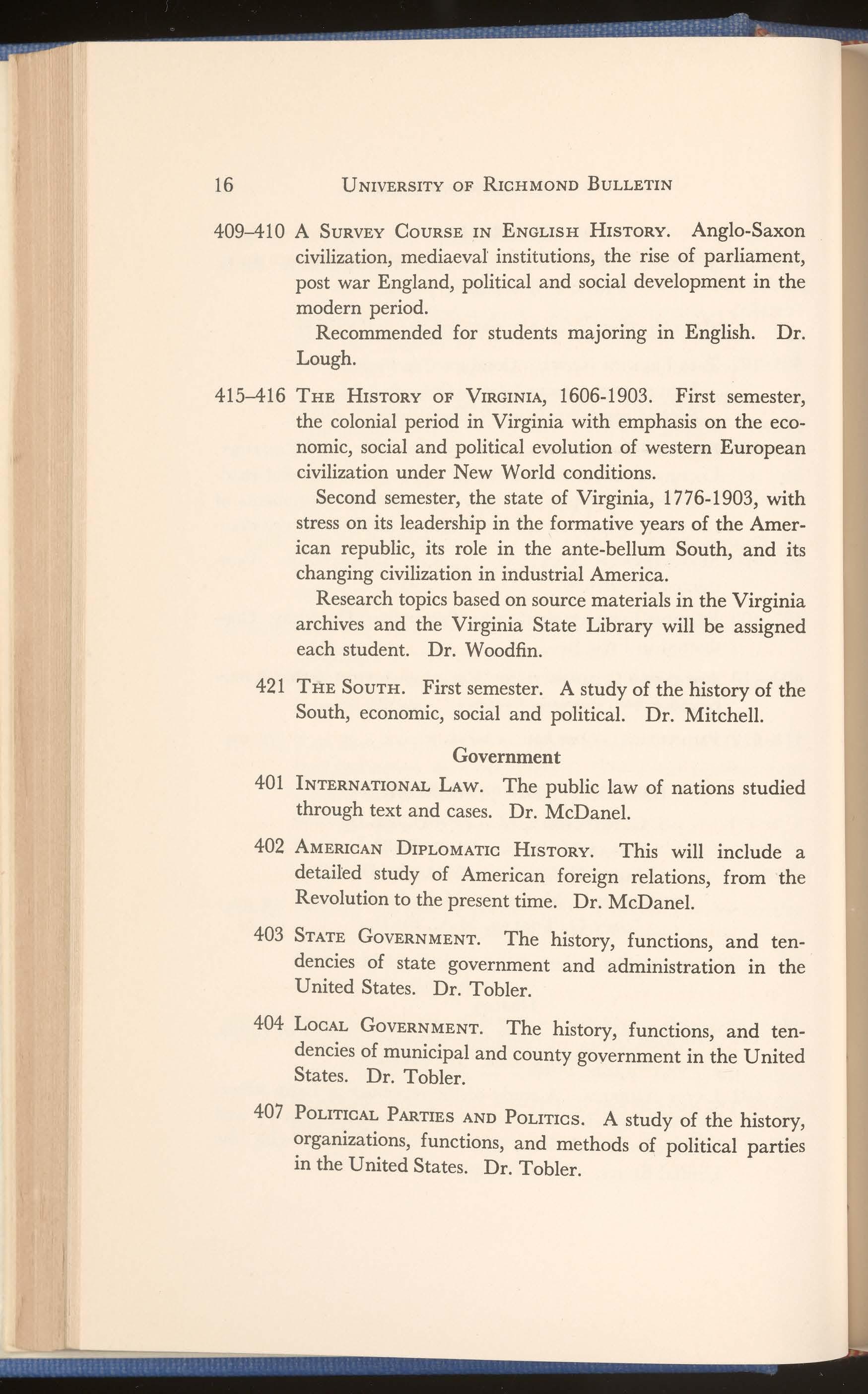 Second semester, the state of Virginia, 1776-1903, with stress on its leadership in the formative years of the American republic, its role in the ante-bellum South, and its changing civilization in industrial America.