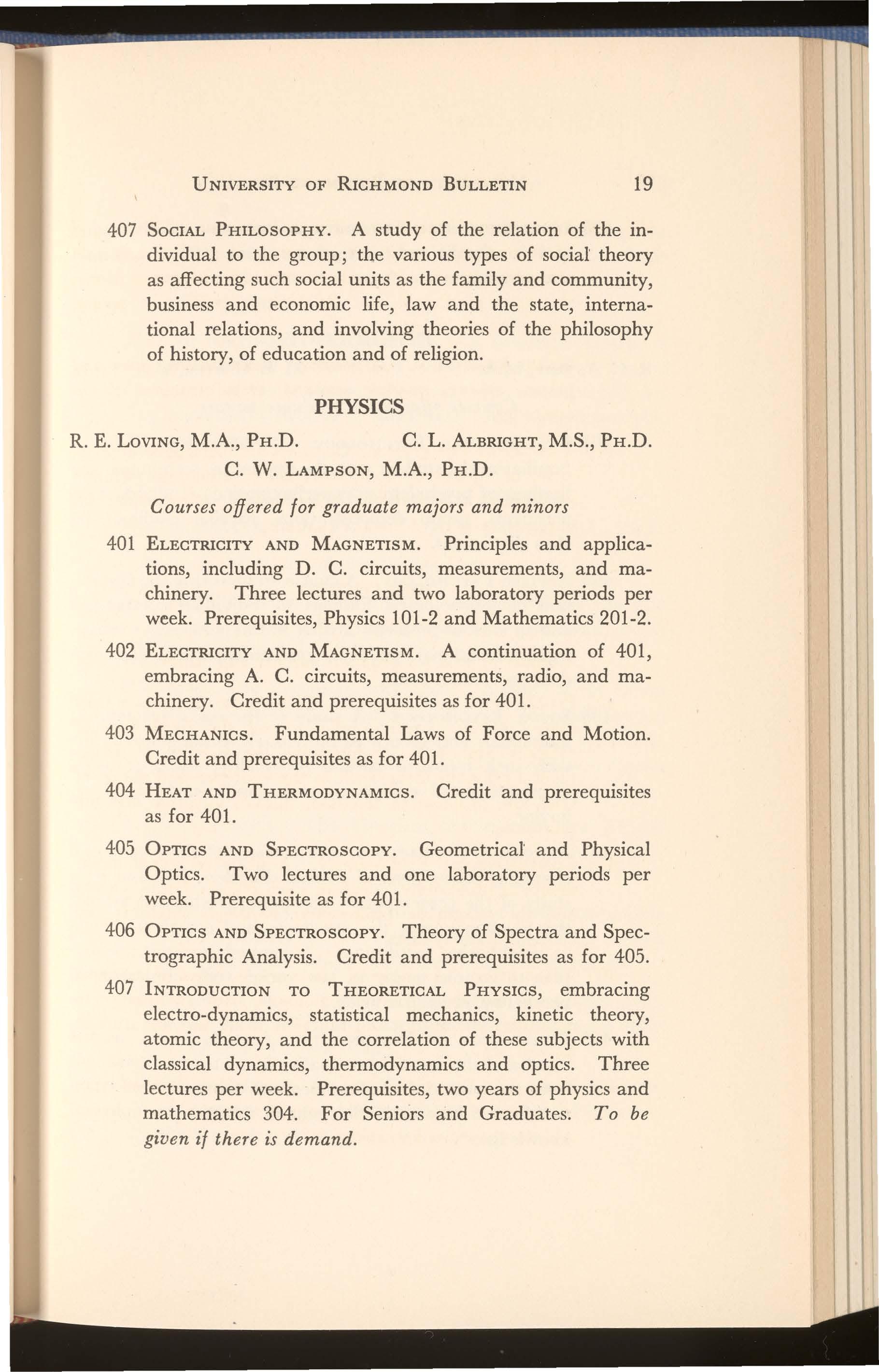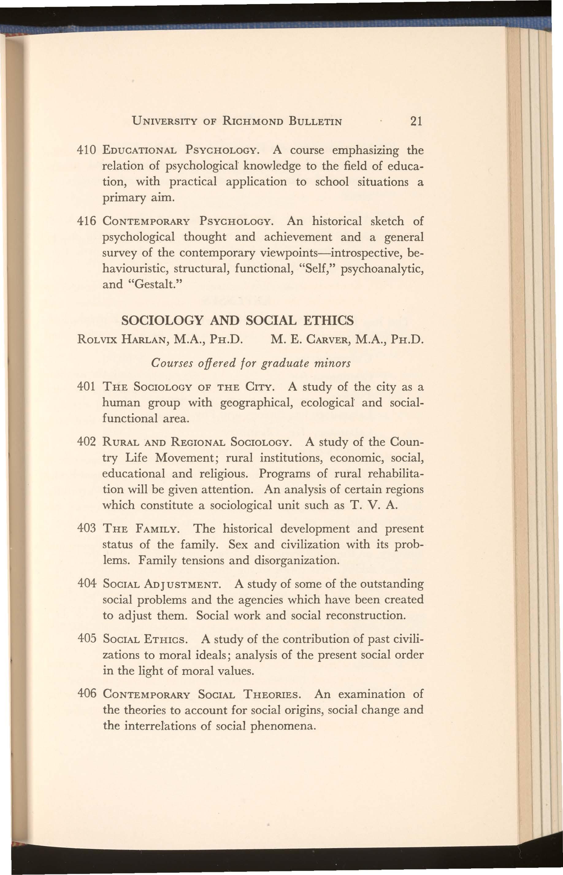 The University of Richmond is in a locality which affords unusual opportunities for research in certain fields. For example, a student of history in the city of Richmond has access to a wealth of source materials nowhere else to be found. Similar opportunities are offered to a student of government. Furthermore the rapid industrial growth of the city and the surrounding territory has brought within the reach of the University industrial plants in great number and variety which illustrate the increasing applications of science.