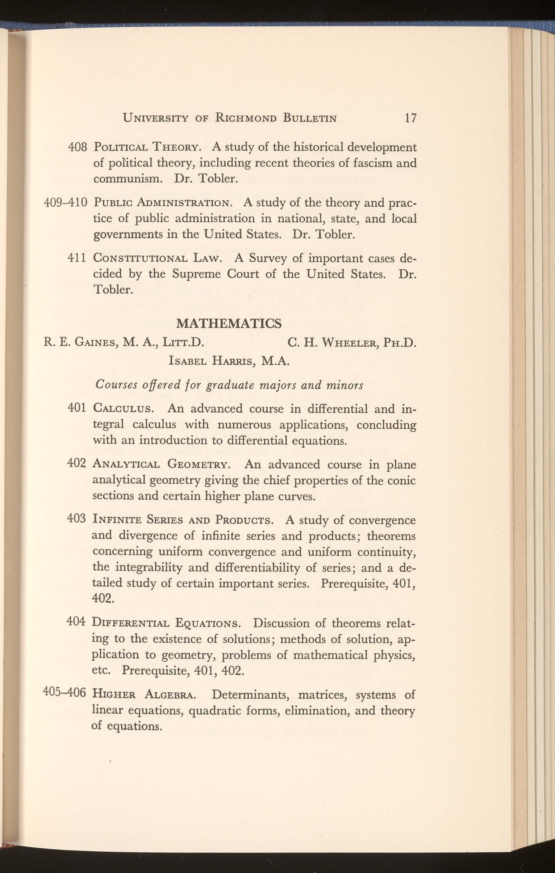 401 CALCULUS. An advanced course in differential and integral calculus with numerous applications, concluding with an introduction to differential equations.