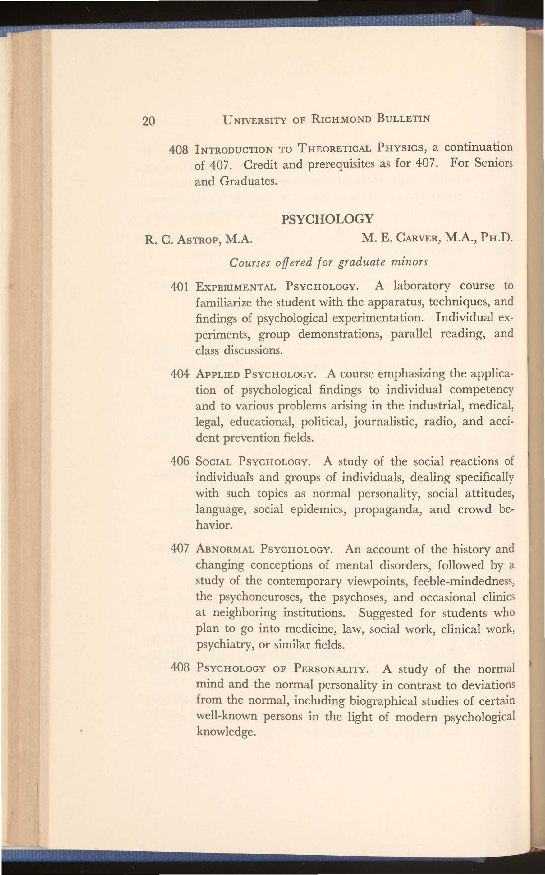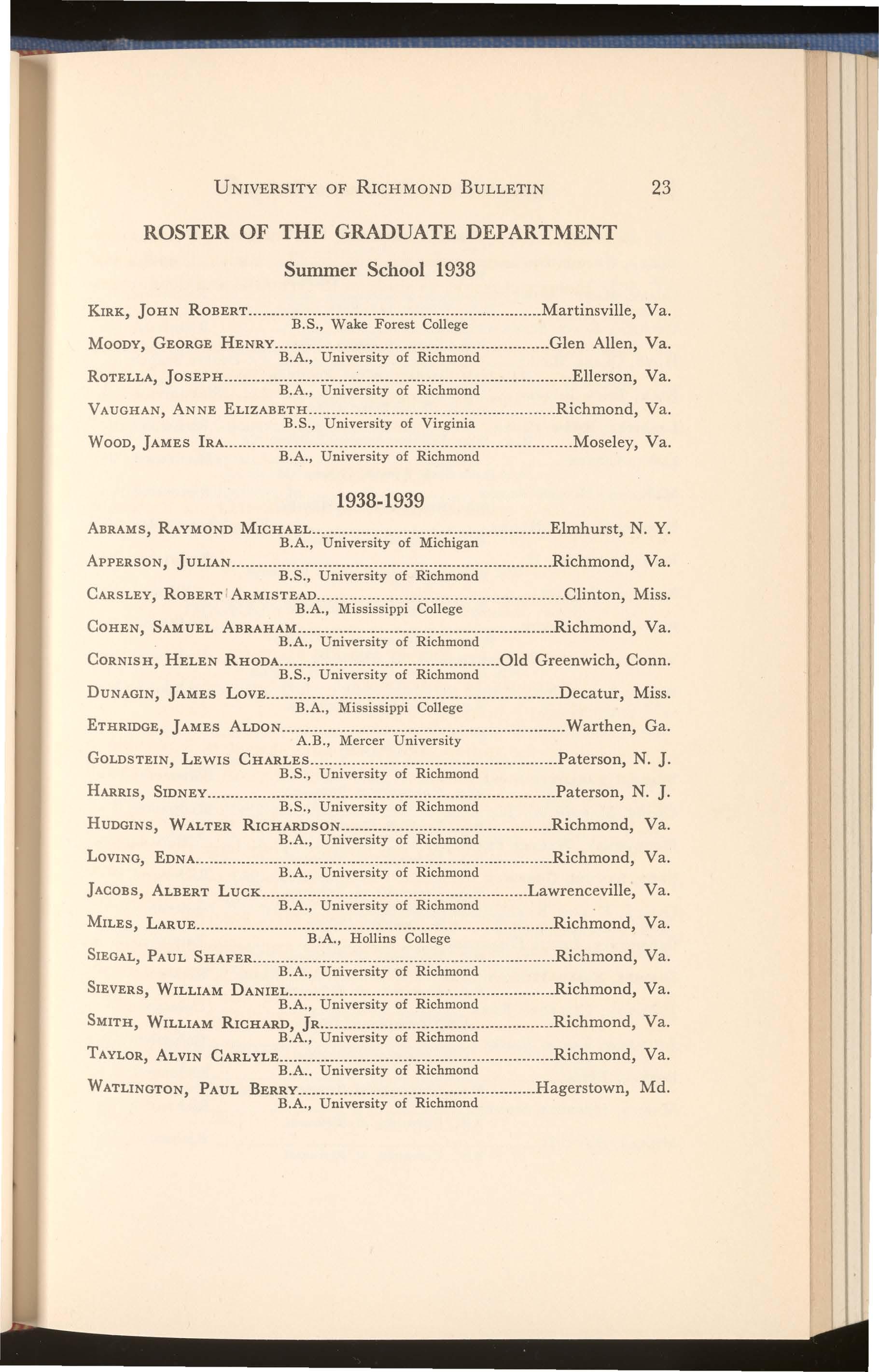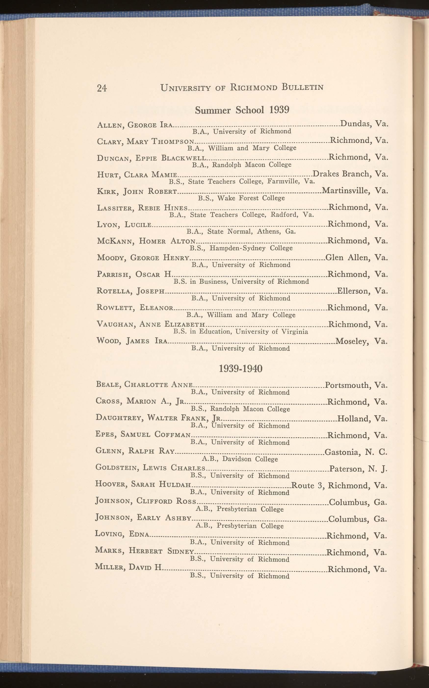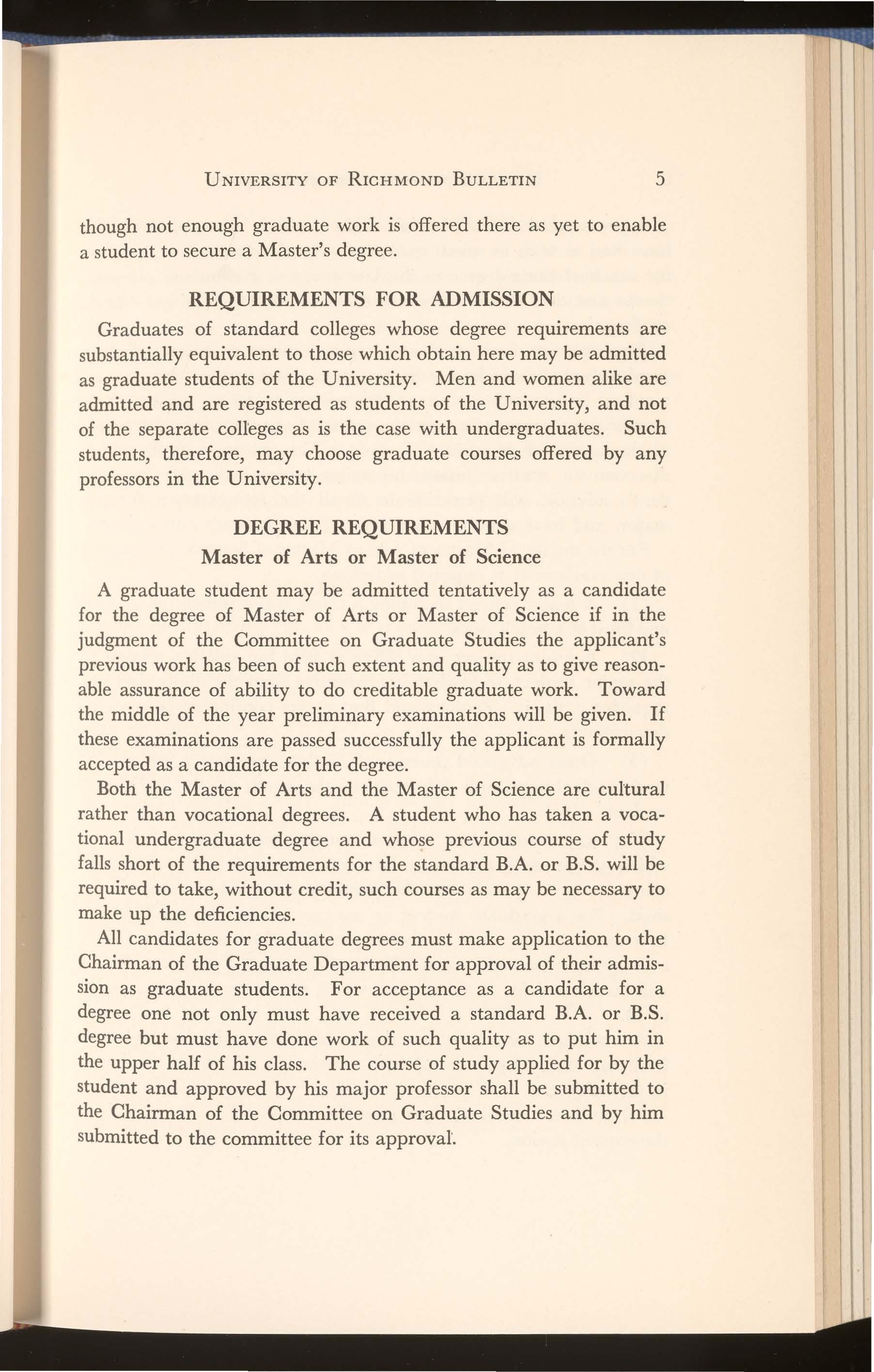 The University of Richmond offers graduate courses in certain departments to qualified students, and confers the degrees Master of Arts and Master of Science upon those who fulfill the requirements as outlined below. Both Richmond College and Westhampton College offer work leading to the degrees of Master of Arts and Master of Science. Work for these degrees may also be done in Summer School. In 1939 the Trustees also authorized the Summer School to offer graduate courses leading to the degree of Master of Science in Education. This degree may only be taken for work done in Education in the Summer School, as the Faculty and offerings in the department of Education are much larger at that time. Some graduate work has also been arranged in the field of Economics for students in the Evening School of Business Administration, al-