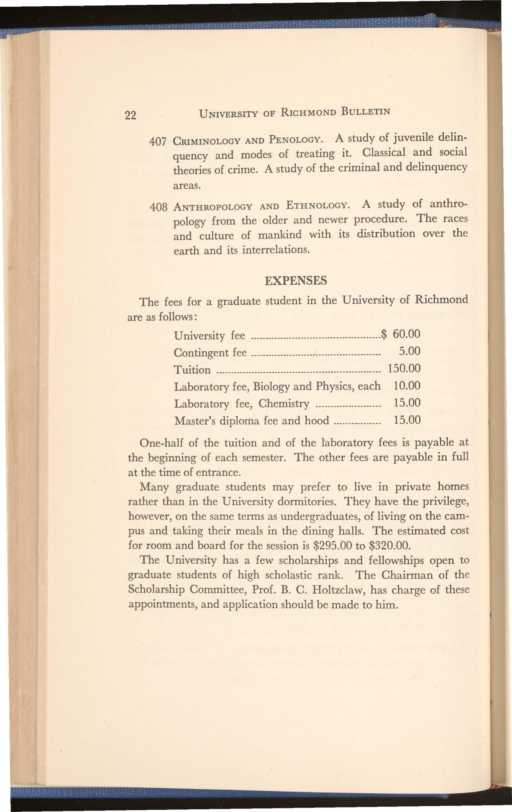The University has a few scholarships and fellowships open to graduate students of high scholastic rank. The Chairman of th e Scholarship Committee, Prof. B. C. Holtzclaw, has charge of thes e appointments, and application should be made to him.