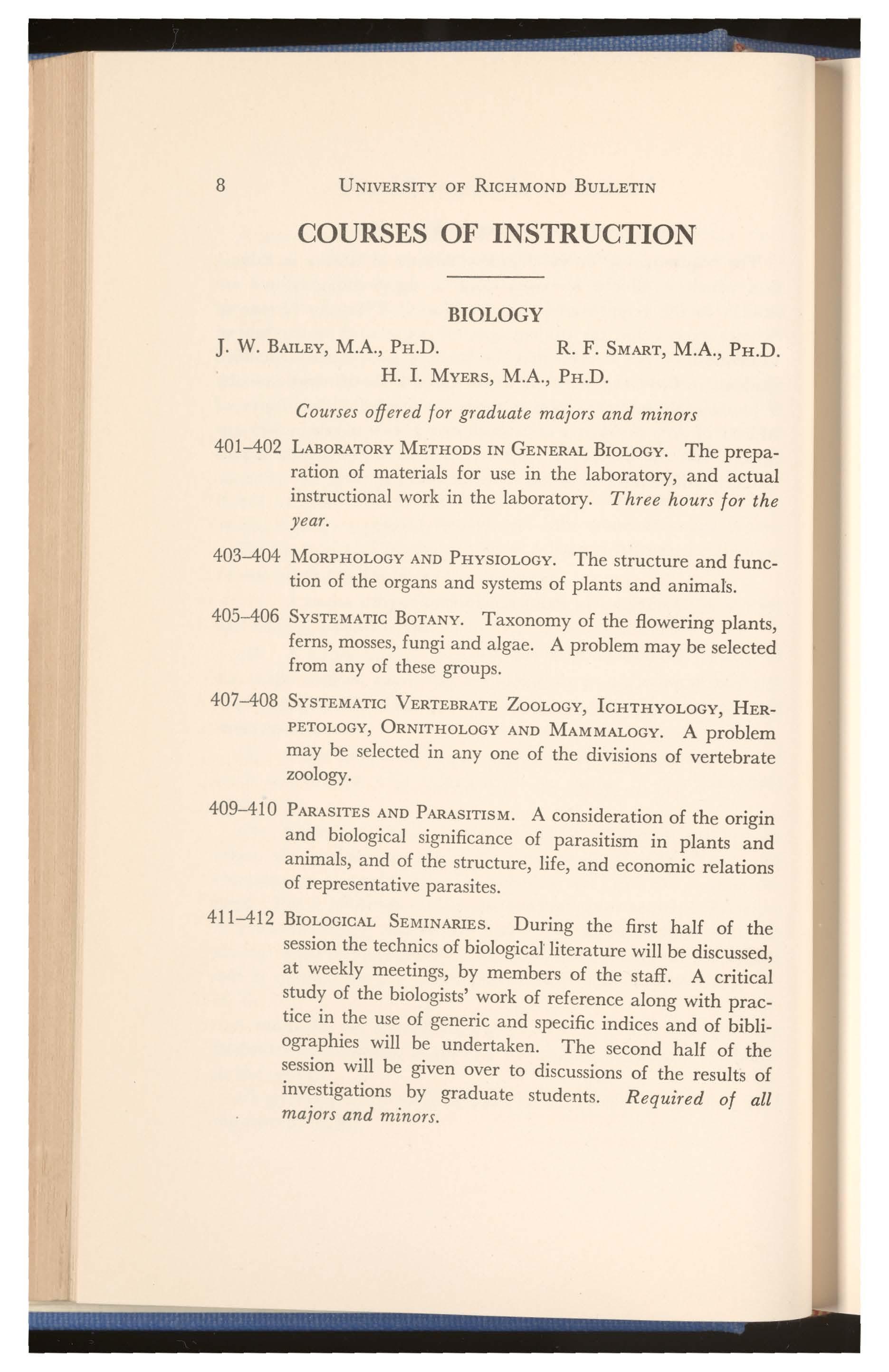 411--412 BIOLOGICALSEMINARIES. During the first half of the session the technics of biological literature will be discussed, at weekly meetings, by members of the staff. A critical study of the biologists' work of reference along with practice in the use of generic and specific indices and of bibliographies will be undertaken. The second half of the session will be given over to discussions of the results of investigations by graduate students. Required of all majors and minors.