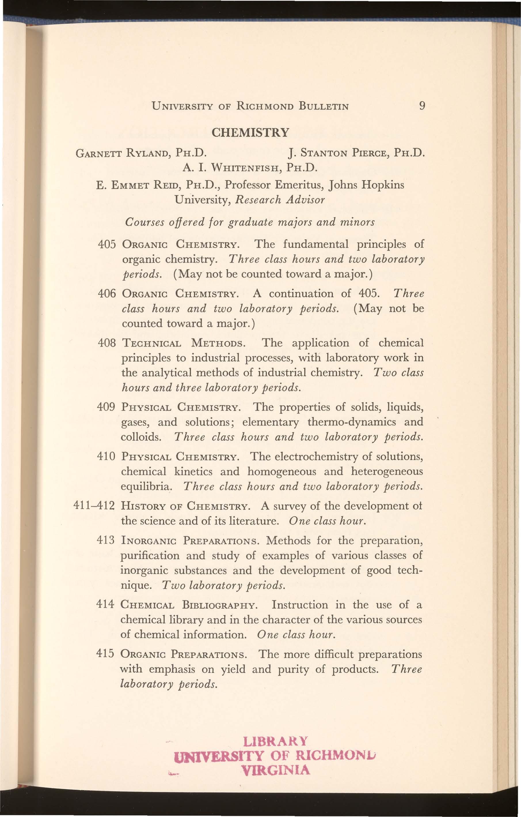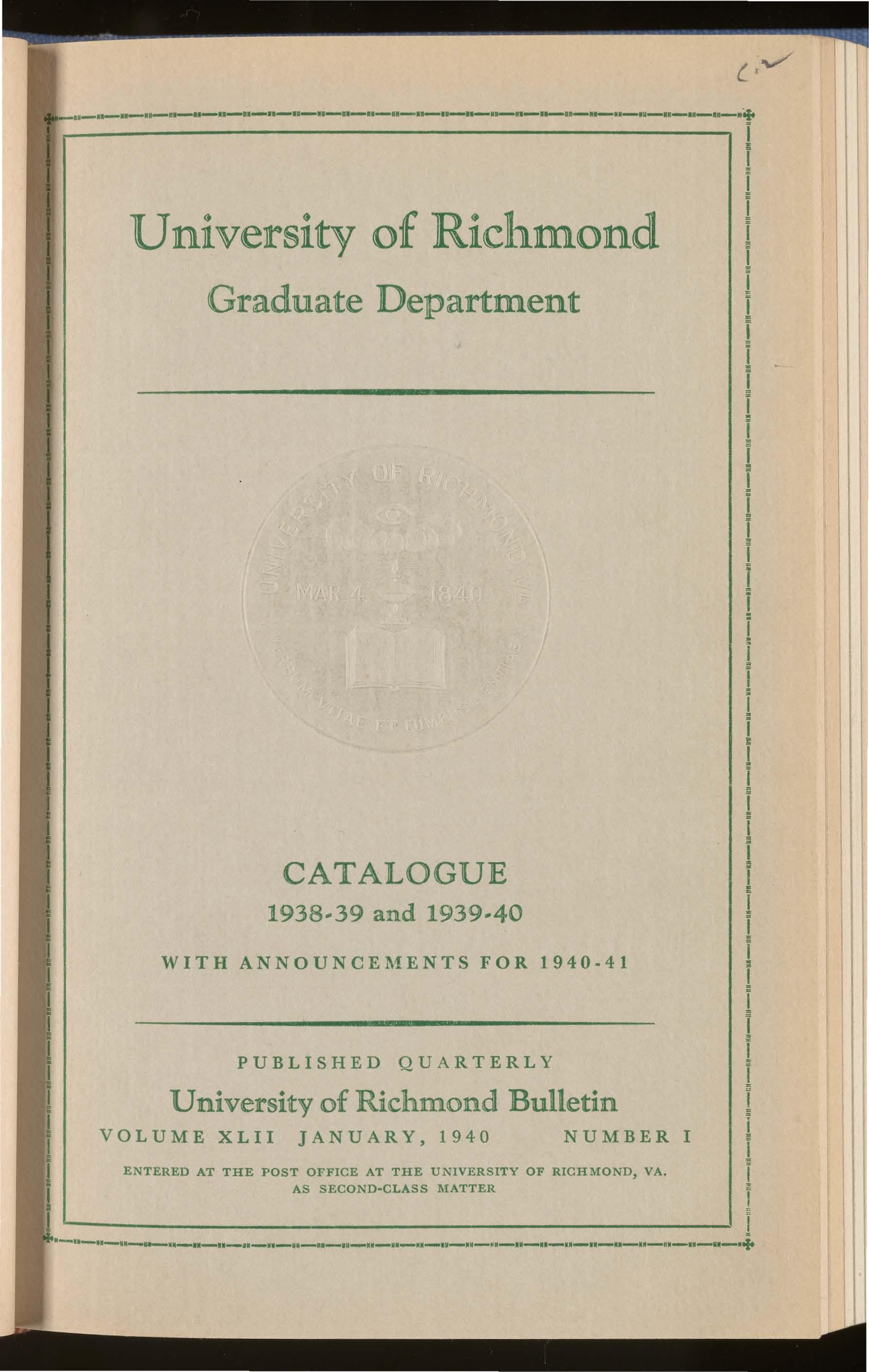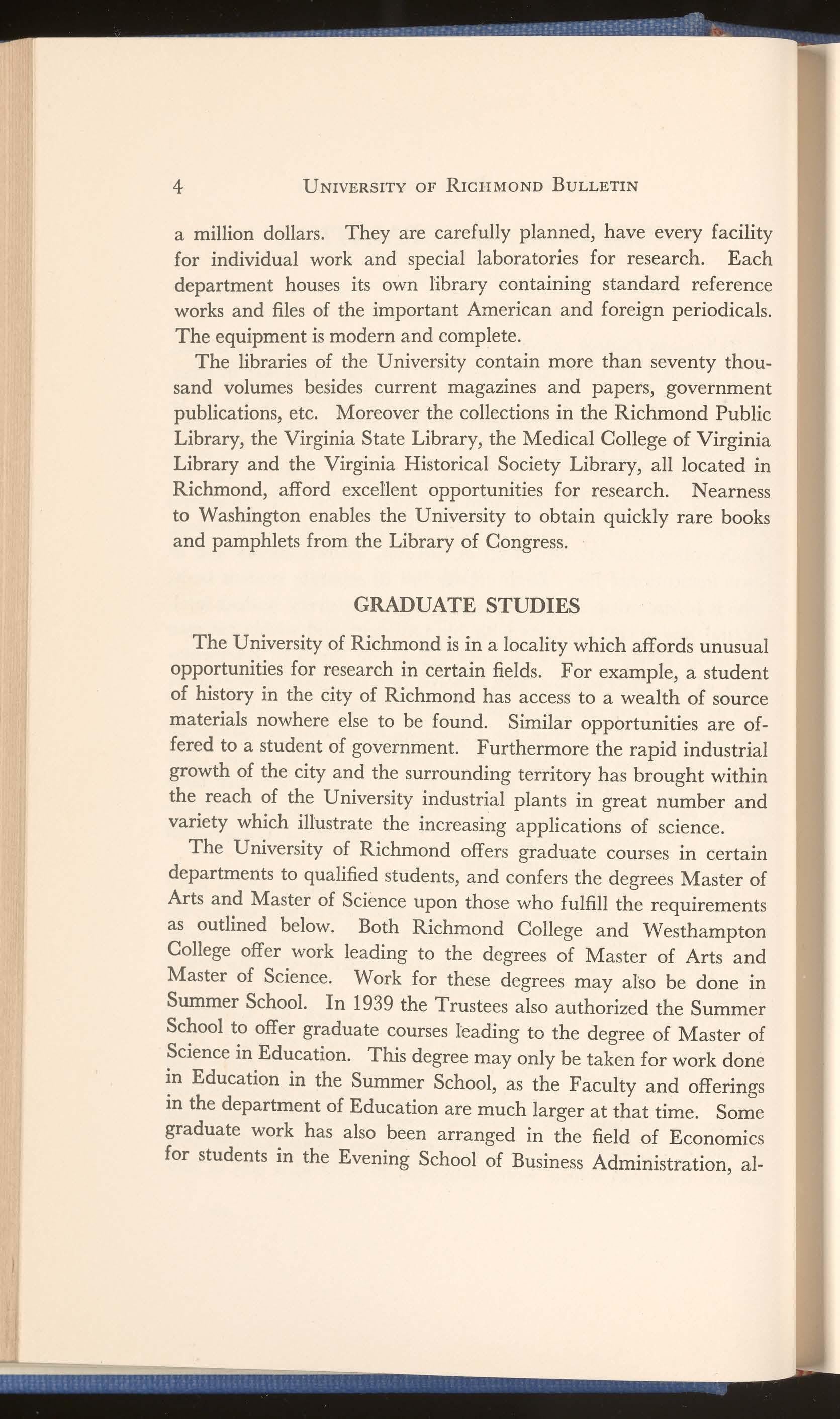 The libraries of the University contain more than seventy thousand volumes besides current magazines and papers, government publications, etc. Moreover the collections in the Richmond Public Library, the Virginia State Library, the Medical College of Virginia Library and the Virginia Historical Society Library, all located in Richmond, afford excellent opportunities for research. Nearness to Washington enables the University to obtain quickly rare books and pamphlets from the Library of Congress.