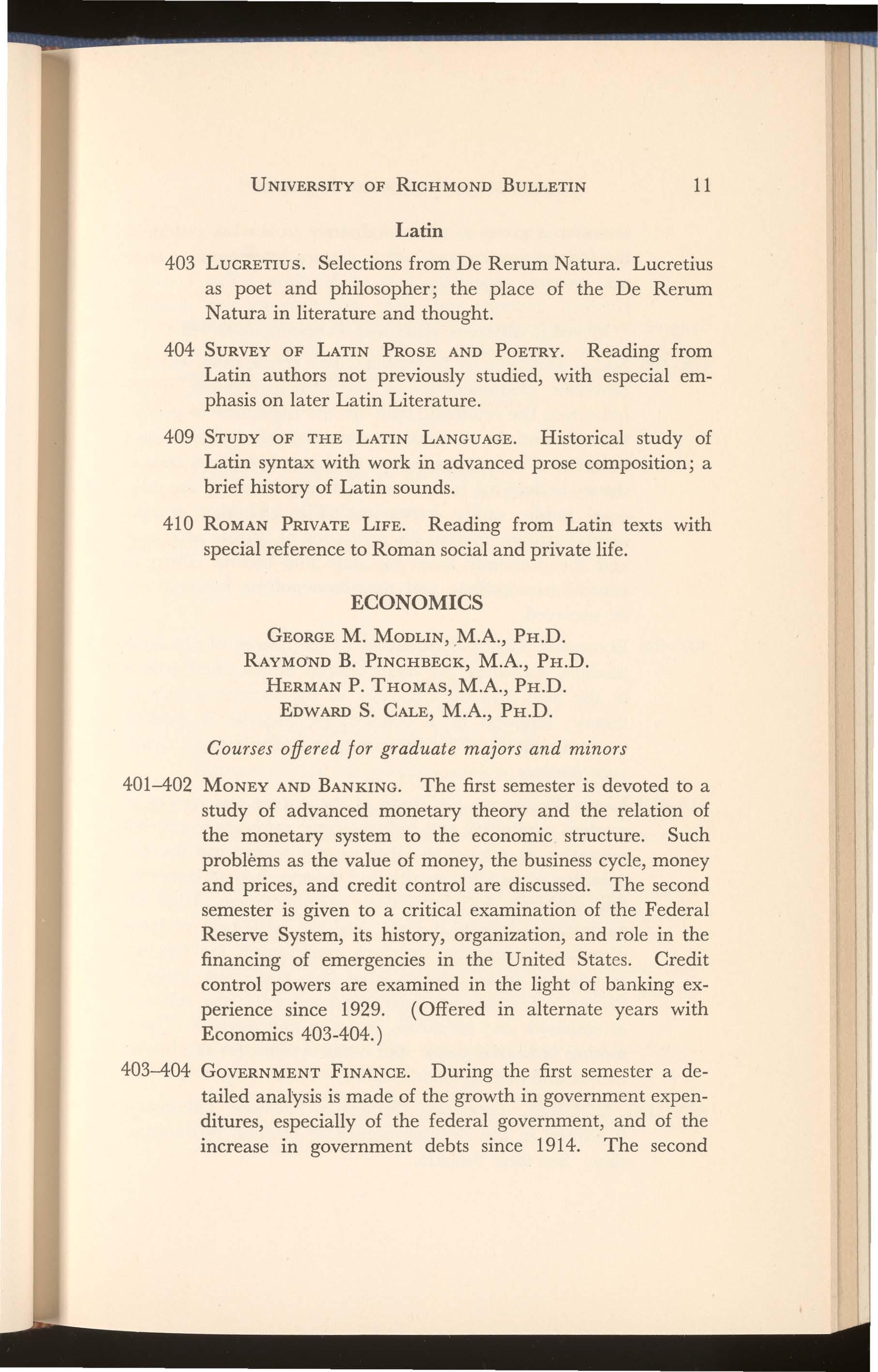 401-402 MoNEY ANDBANKING. The first semester is devoted to a study of advanced monetary theory and the relation of the monetary system to the economic structure. Such problems as the value of money, the business cycle, money and prices, and credit control are discussed. The second semester is given to a critical examination of the Federal Reserve System, its history, organization, and role in the financing of emergencies in the United States. Credit control powers are examined in the light of banking experience since 1929. (Offered in alternate years with Economics 403-404.)