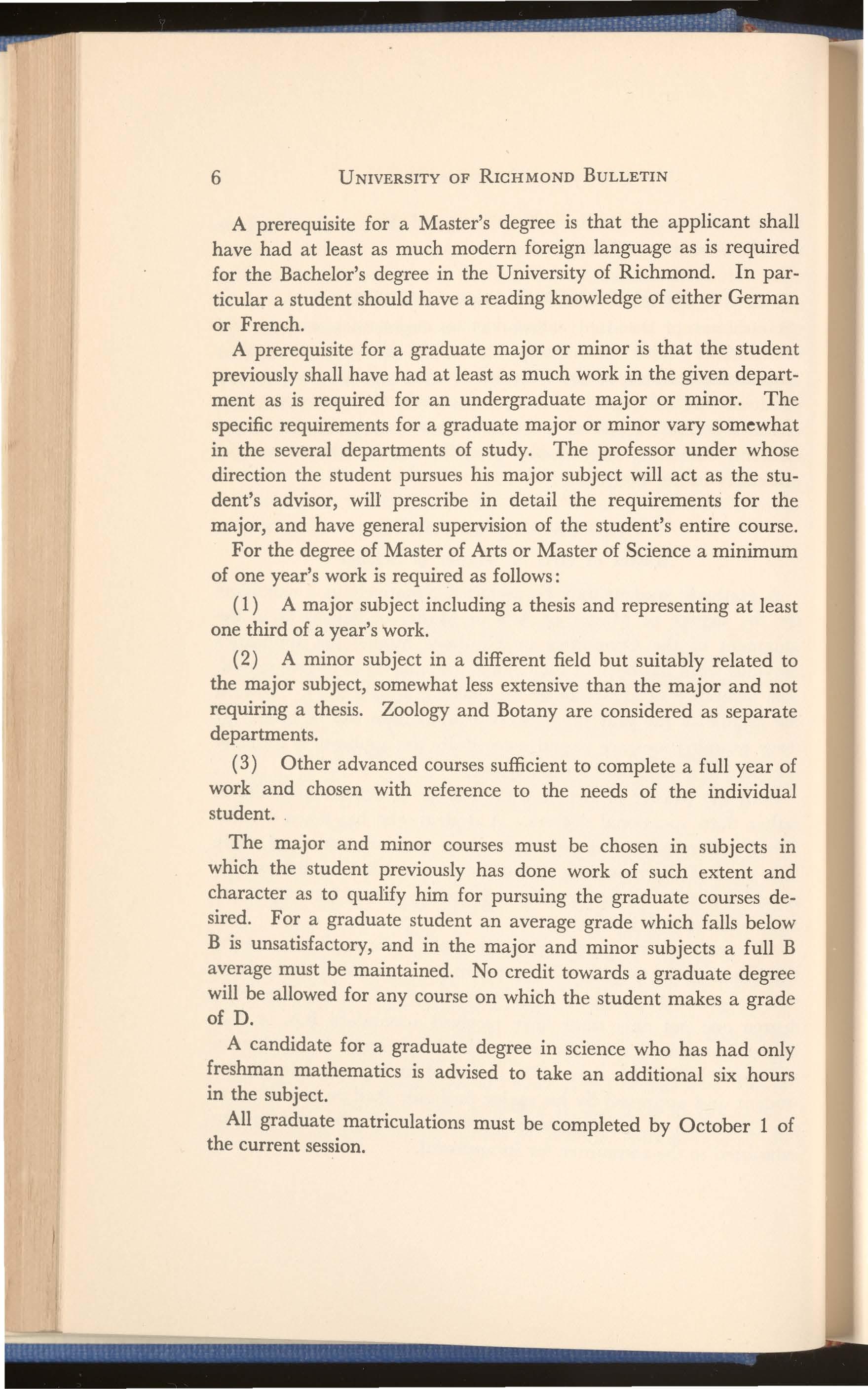 A prerequisite for a Master's degree is that the applicant shall have had at least as much modern foreign language as is required for the Bachelor's degree in the University of Richmond. In particular a student should have a reading knowledge of either German or French.