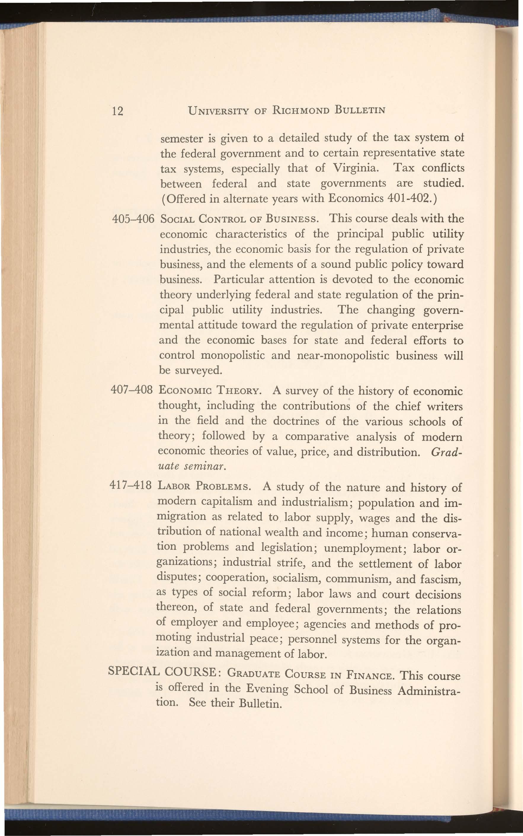 405-406 SocIAL CoNTROLOF BusINESS. This course deals with the economic characteristics of the principal public utility industries, the economic basis for the regulation of private business, and the elements of a sound public policy toward business. Particular attention is devoted to the economic theory underlying federal and state regulation of the principal public utility industries. The changing governmental attitude toward the regulation of private enterprise and the economic bases for state and federal efforts to control monopolistic and near-monopolistic business will be surveyed.