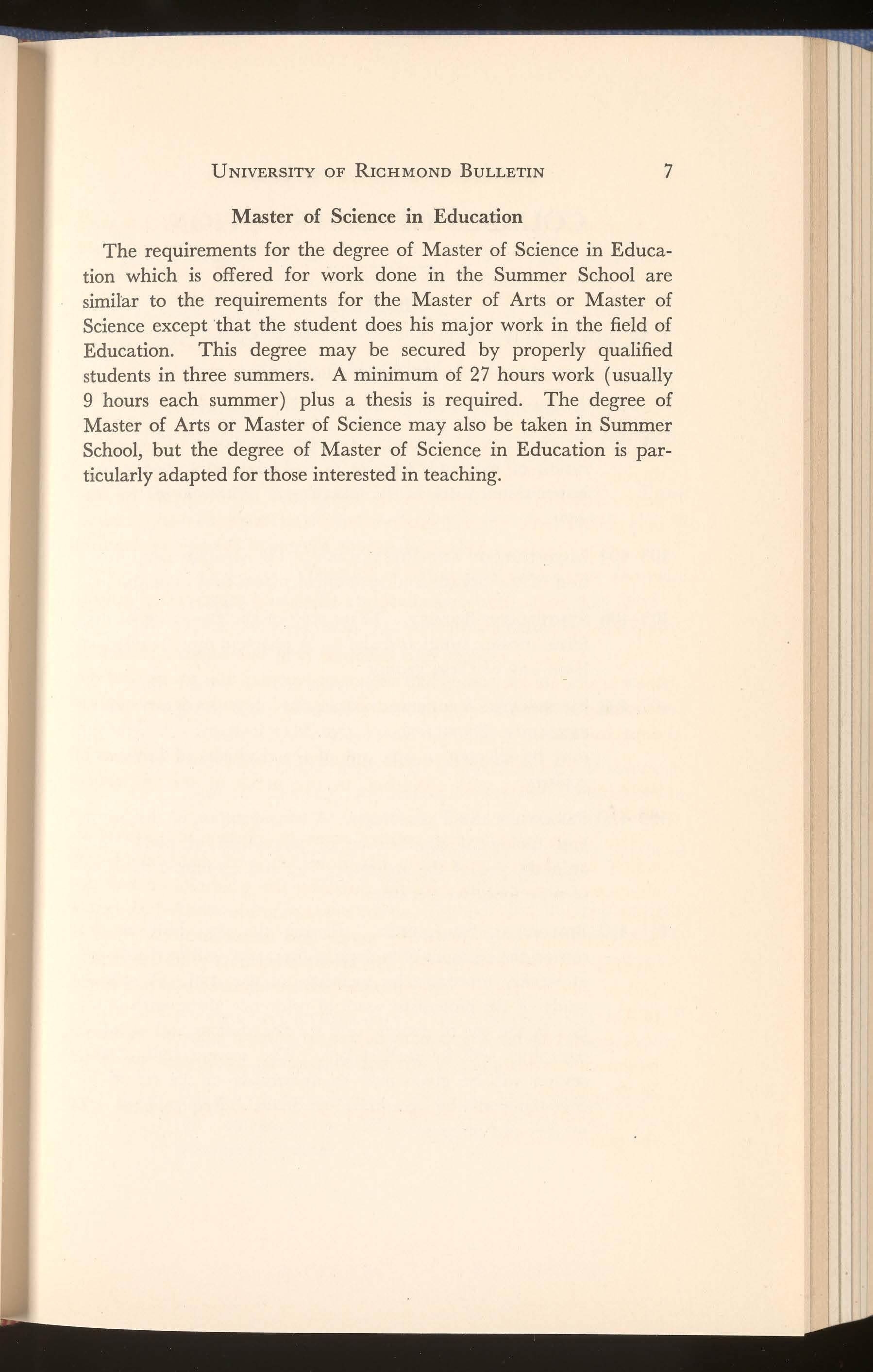The requirements for the degree of Master of Science in Education which is offered for work done in the Summer School are simitar to the requirements for the Master of Arts or Master of Science except that the student does his major work in the field of Education. This degree may be secured by properly qualified students in three summers. A minimum of 27 hours work ( usually 9 hours each summer) plus a thesis is required. The degree of Master of Arts or Master of Science may also be taken in Summer School, but the degree of Master of Science in Education is particularly adapted for those interested in teaching.