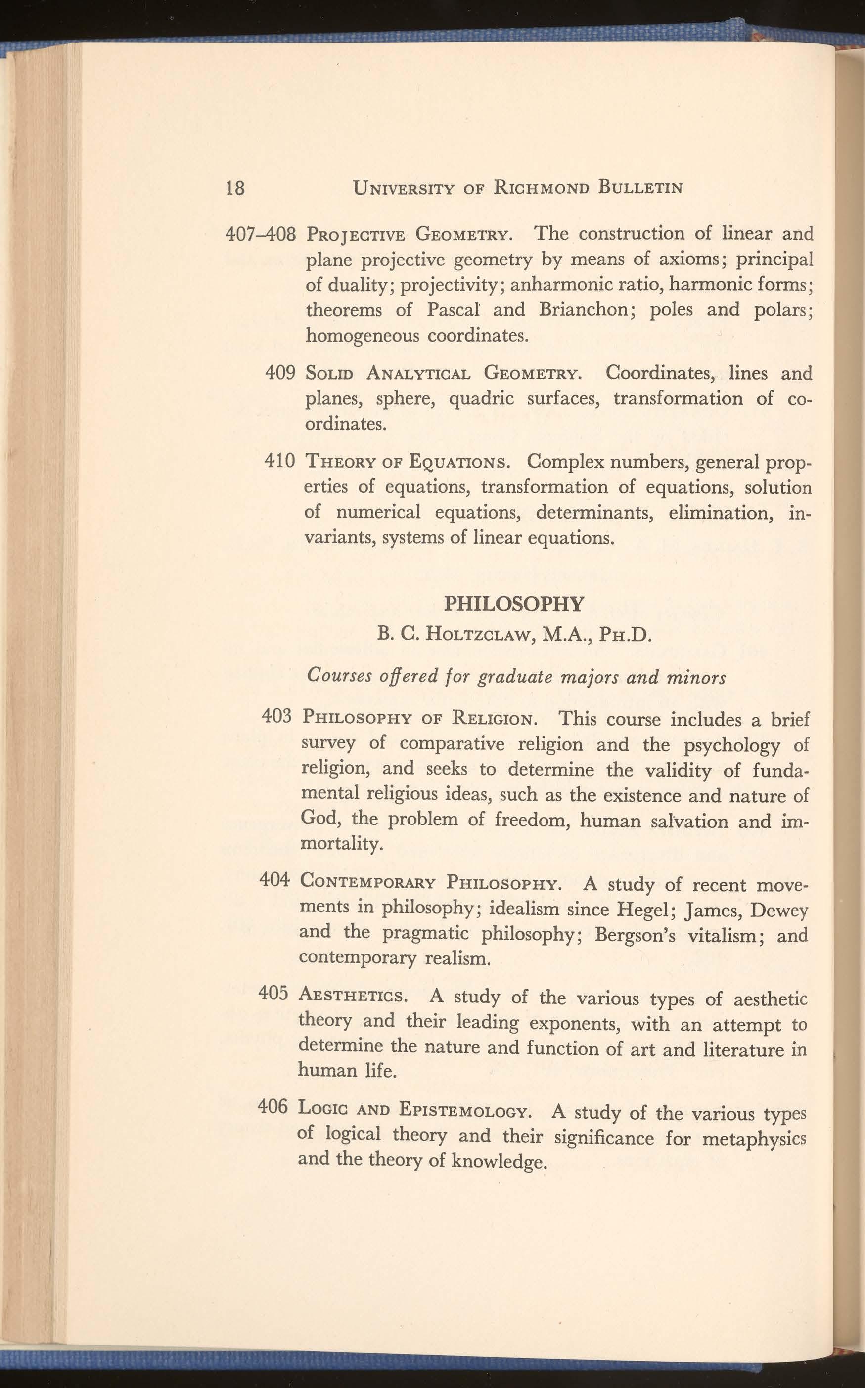 404 CONTEMPORARYPHILOSOPHY. A study of recent movements in philosophy; idealism since Hegel; James, Dewey and the pragmatic philosophy; Bergson's vitalism; and contemporary realism.